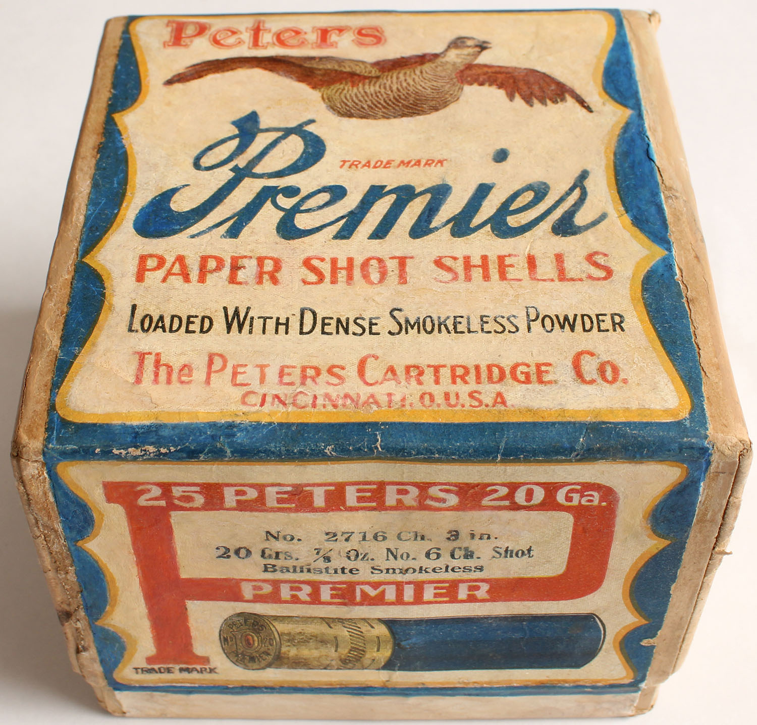 Peters Cart. Co. PREMIER, 20ga., 3'', 2pc., FULL & Professionally RESEALED/touched up, shot size 6 Ch, buff box with multi colored label that pictures a flying Prairie Chicken, box has light scuffing & light age soiling. Grade: Excellent - Value: 500 to 2000