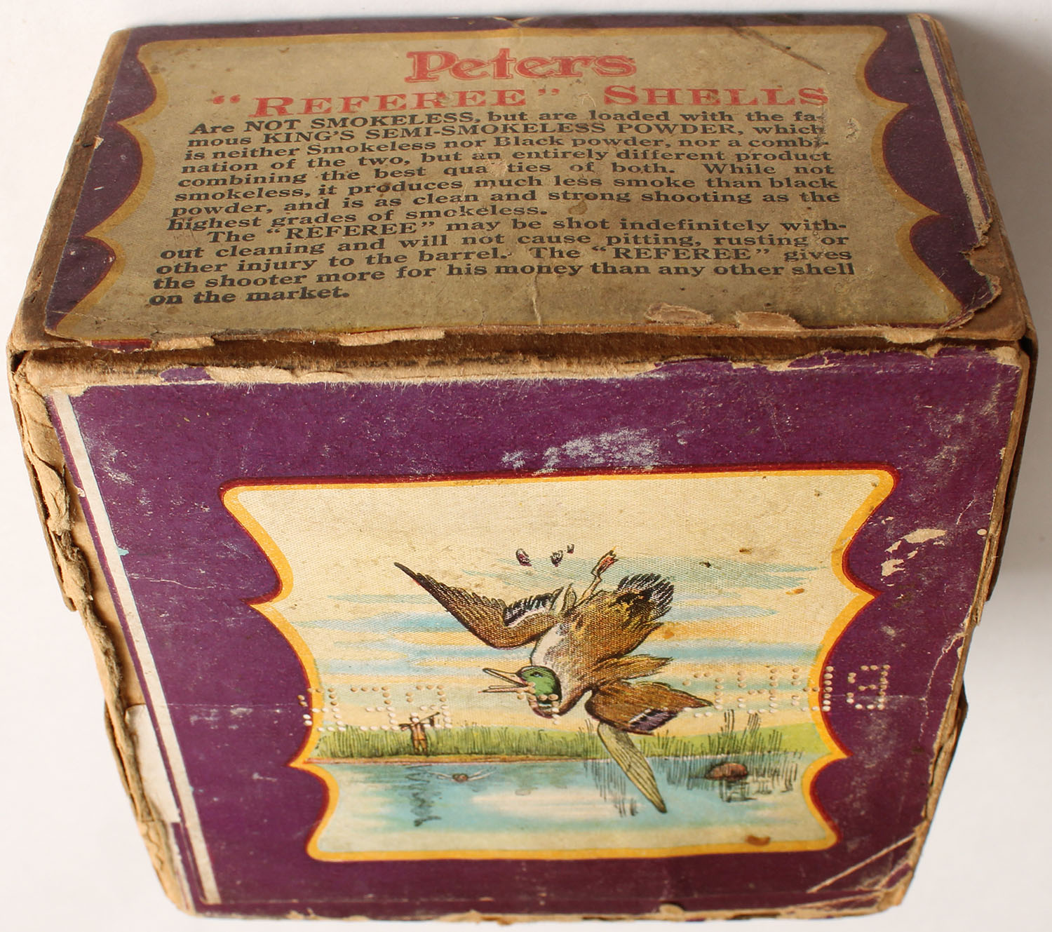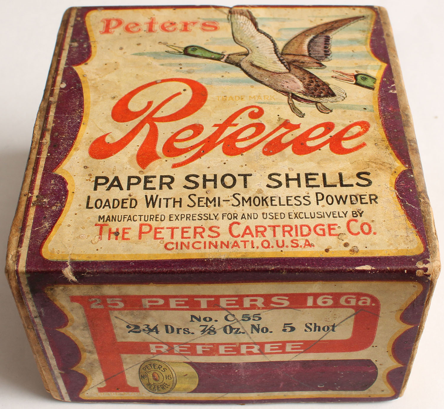 Peters Cart. Co., Referee, 16ga., 2pc., Empty, Shot size 5, No. C55, 2 3/4 Drs., 7/8 Oz., No. 5 Shot, buff box with multi-colored label with flying ducks, box has seam split, soiling, & light edge wear with very nice colors. Grade: Very Good ++ - Value: 150 to 400