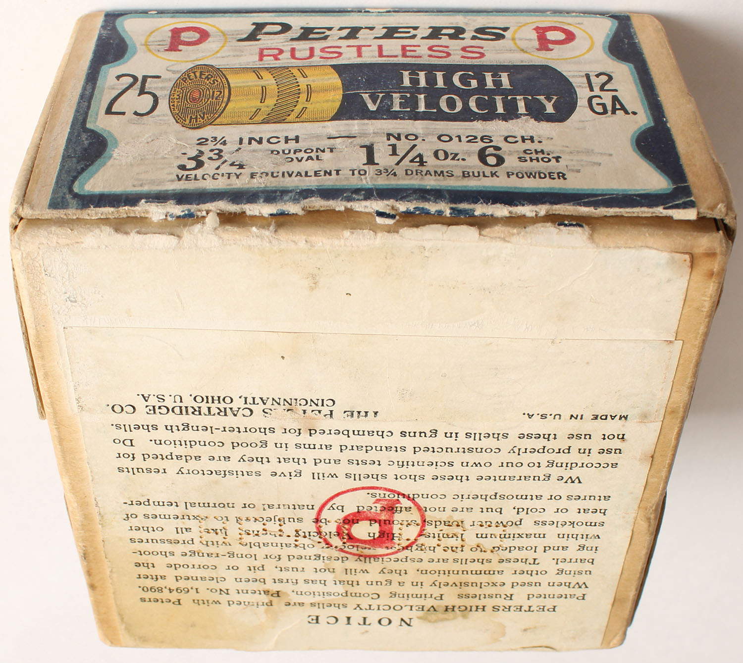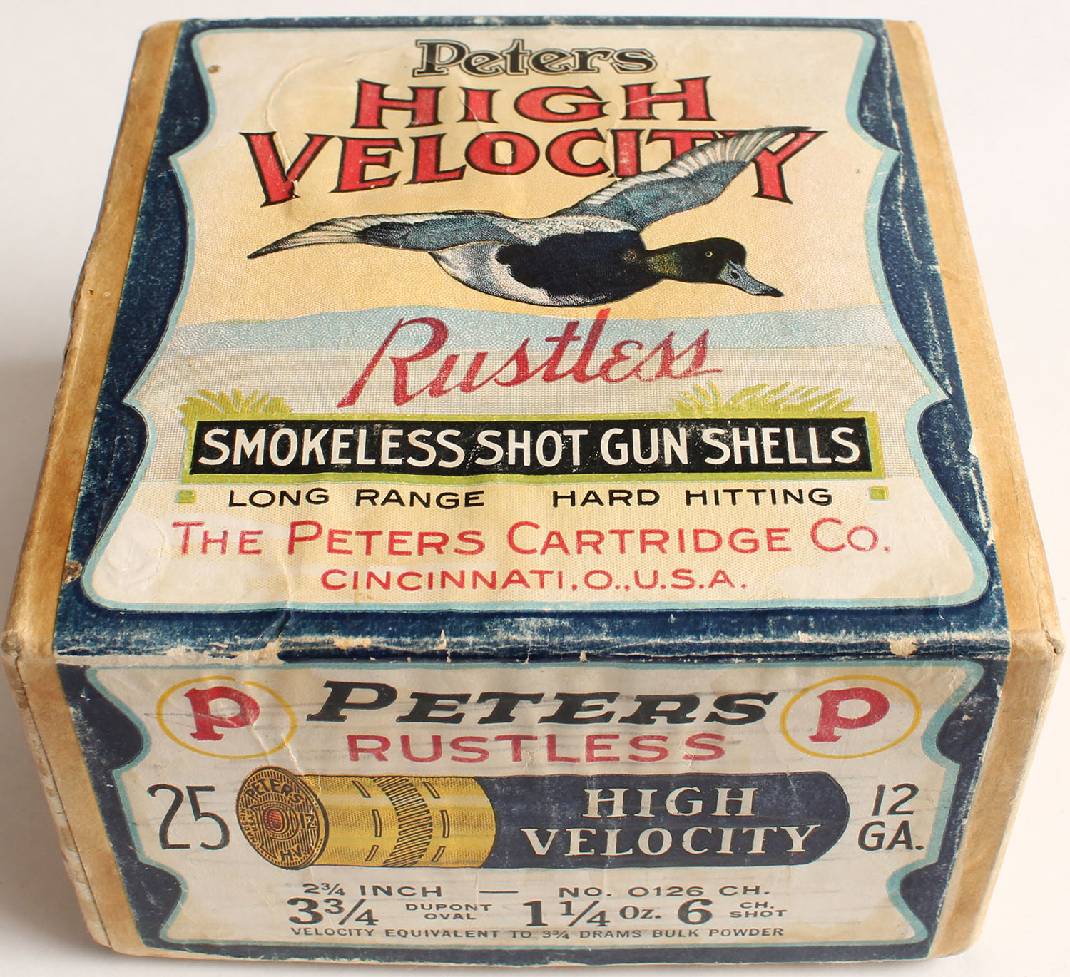 Peters Cart. Co., Blue Bill, 12ga., 2 3/4'', 2pc., Full with 14rds being incorrect shot size, shot size 6 CH shot, buff box with multi colored label that pictures Blue Bill in flight, box has light soiling with great colors, Shells are excellent. Grade: Excellent - Value: 100 to 300
