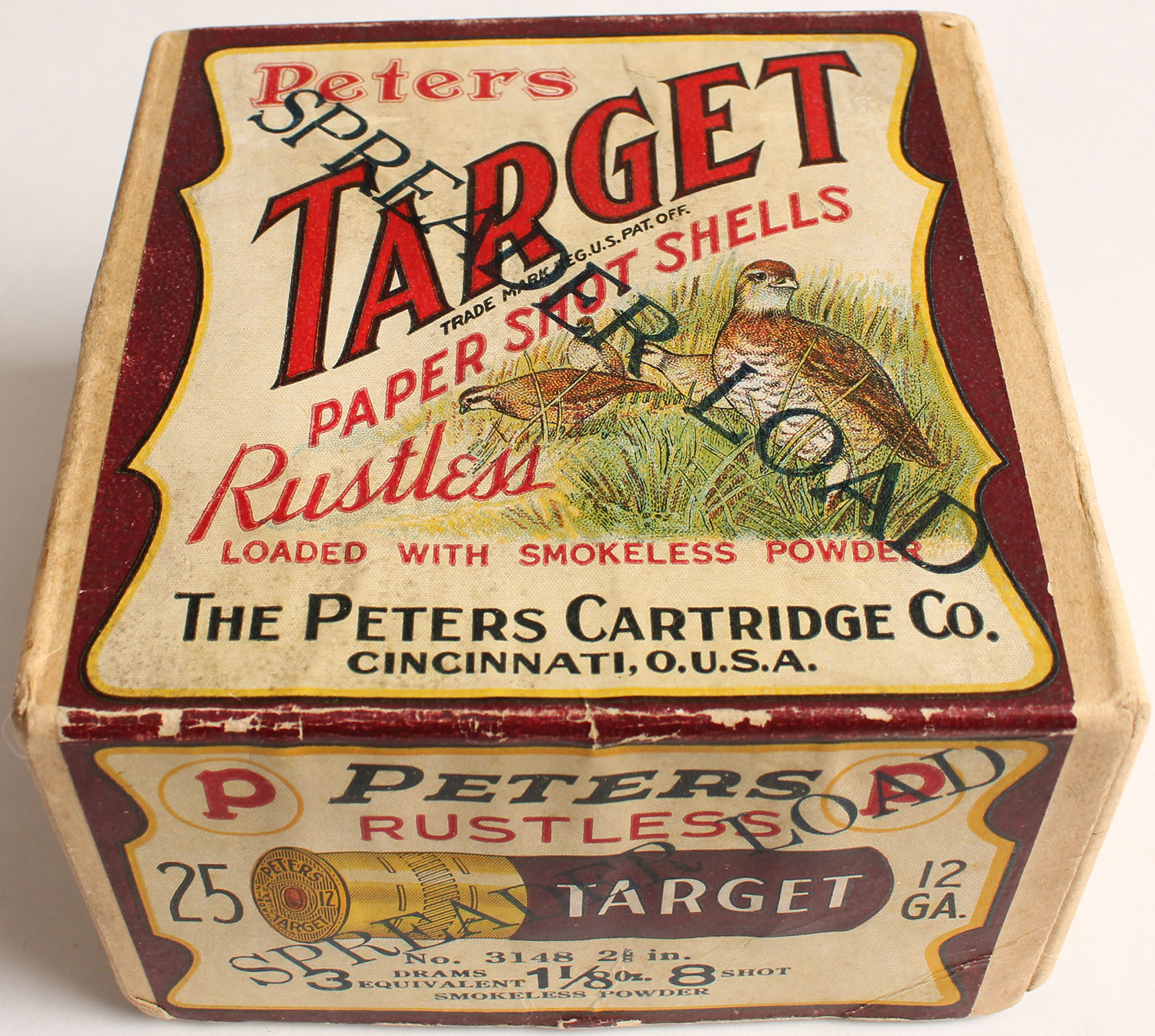 Peters Cart. Co., TARGET, OVER STAMPED ''SPREADER LOAD'', 12ga., 2 5/8'', 2pc., Empty, shot size 8 Shot., buff box with multi-colored label with Covey of Quail in the grass, box is solid & label shows age soiling, box has light edge wear & small tear, Cincinnati, O, U.S.A., Grade: Excellent - Value: 150 to 500