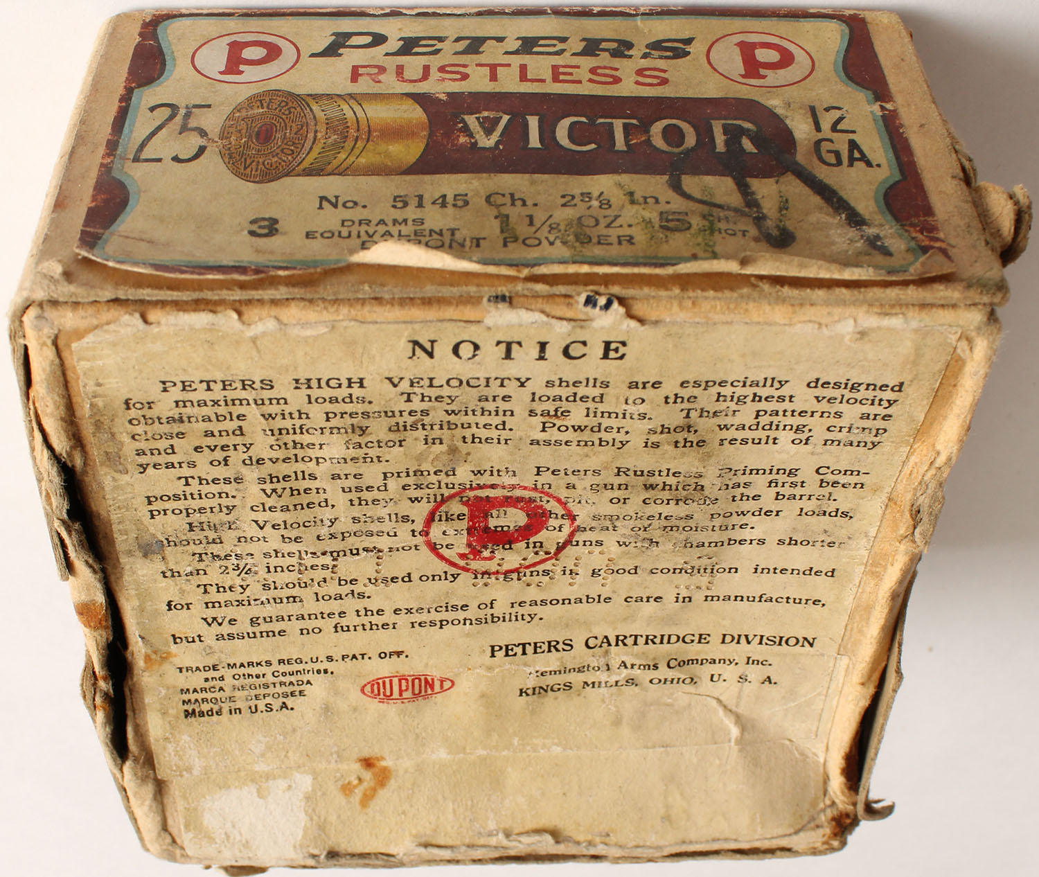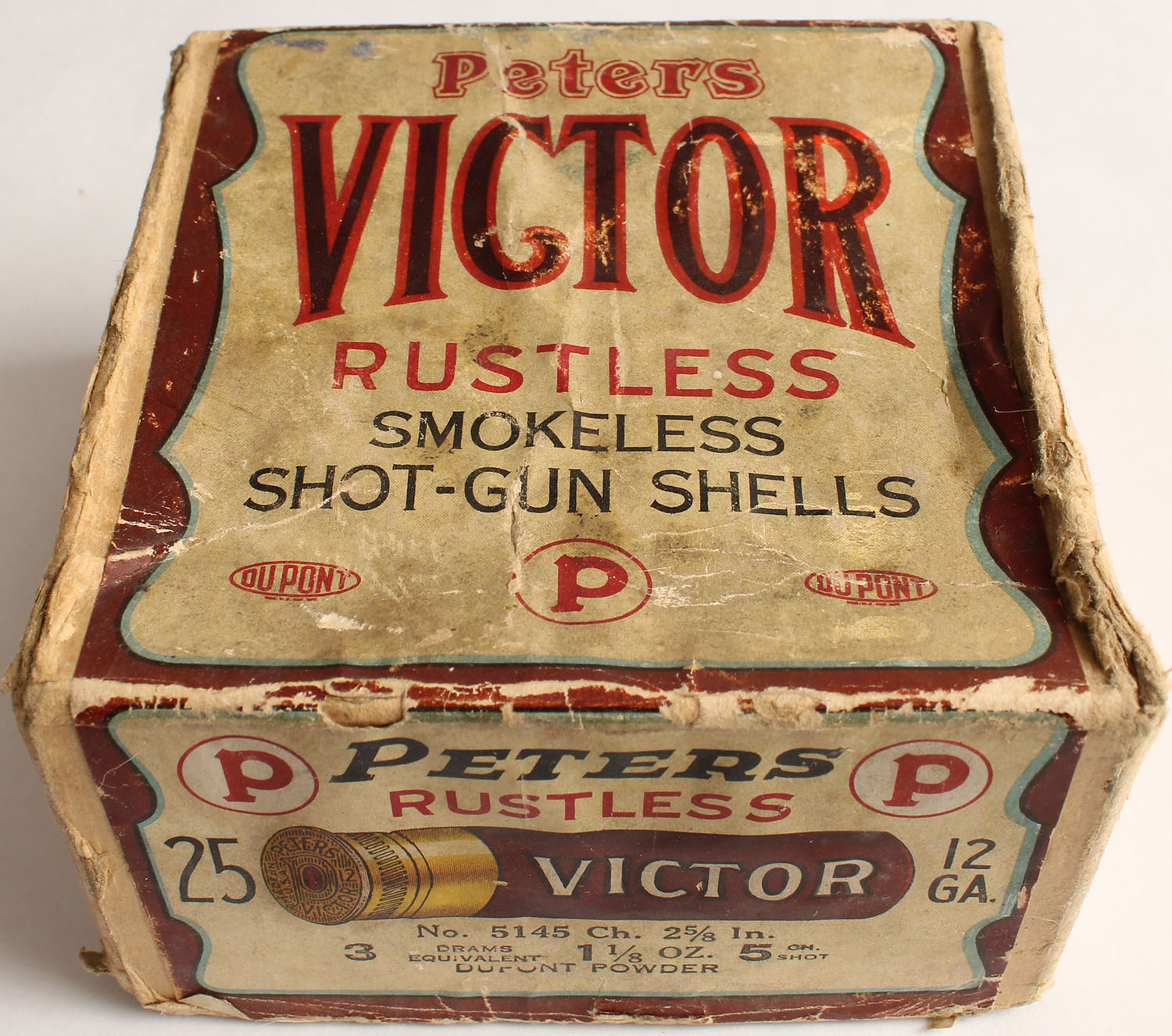 Peters Cart. Div., Victor, Rustless, 12ga., 2 5/8'', 2pc., Empty, shot size 5 Ch, buff box with brown, cream & black label, box has soiling, edge wear, seam splits & tears. Grade: Very Good - Value: 30 to 100