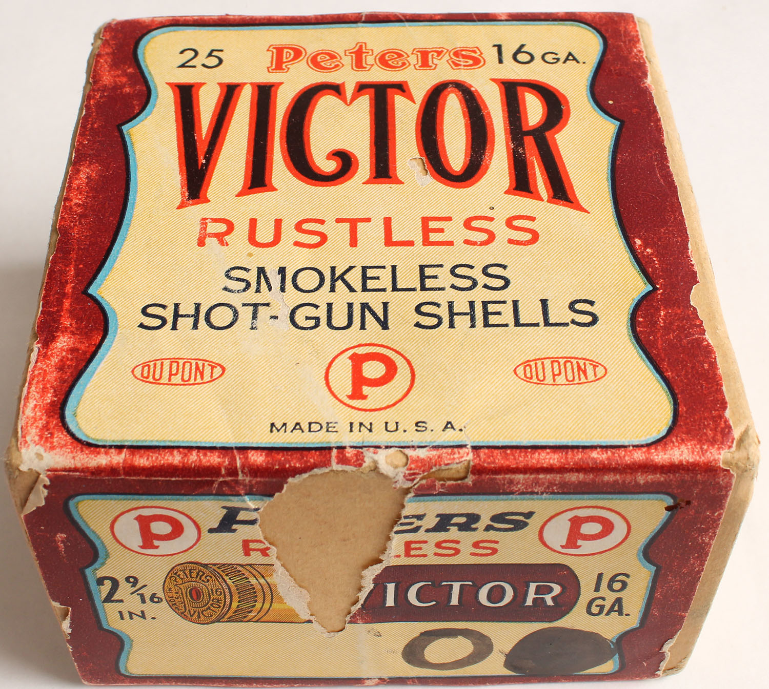 Peters Cart. Div., Victor, Rustless, 16ga., 2 9/16'', 2pc., FULL & SEALED, shot size 0 Buck, buff box with maroon, cream & orange label, box is very solid with light edge wear, label is torn but has great colors. Grade: Excellent - Value: 50 to 250