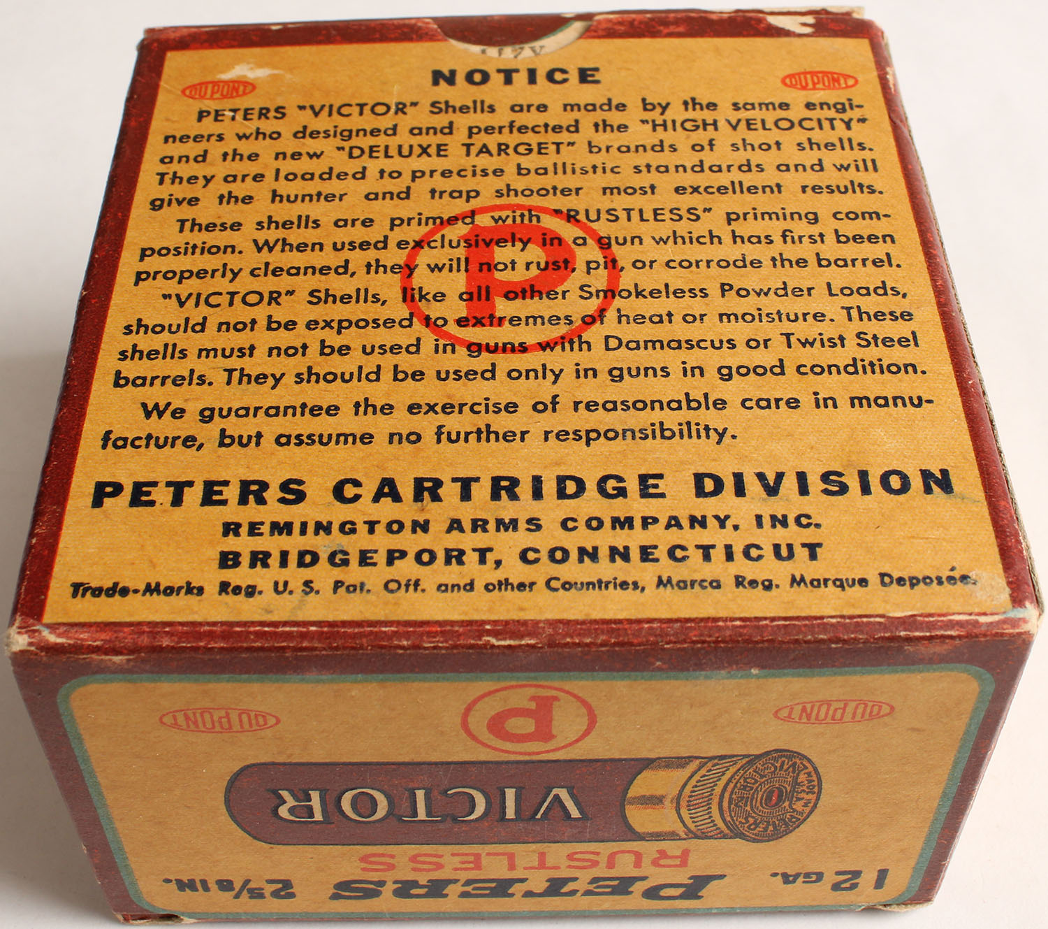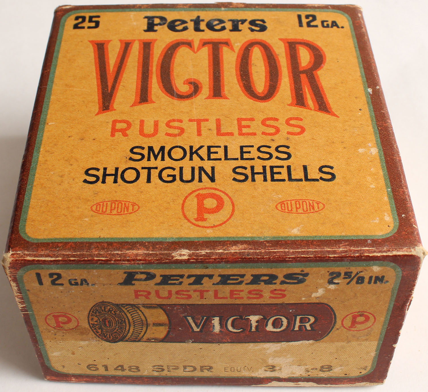 Peters Cart. Div., Victor, Rustless, 12ga., 2 5/8'', 1pc., Full, shot size 8 Spreader load, maroon, cream & orange box, box is solid with age soiling & light scuffing, box has nice colors, Shells are very good. Grade: Very Good ++ - Value: 20 to 60