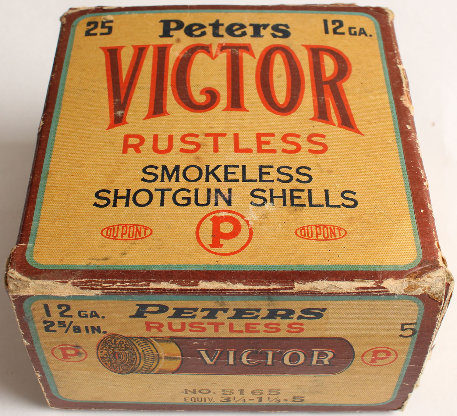 Peters Cart. Div., Victor, Rustless, 12ga., 2 5/8'', 1pc., Partial 21rds, shot size 5, maroon, cream & orange box, box is solid with light soiling, light scuffing & inside flap is torn, box has nice colors, Shells are very good. Grade: Very Good ++ - Value: 20 to 60