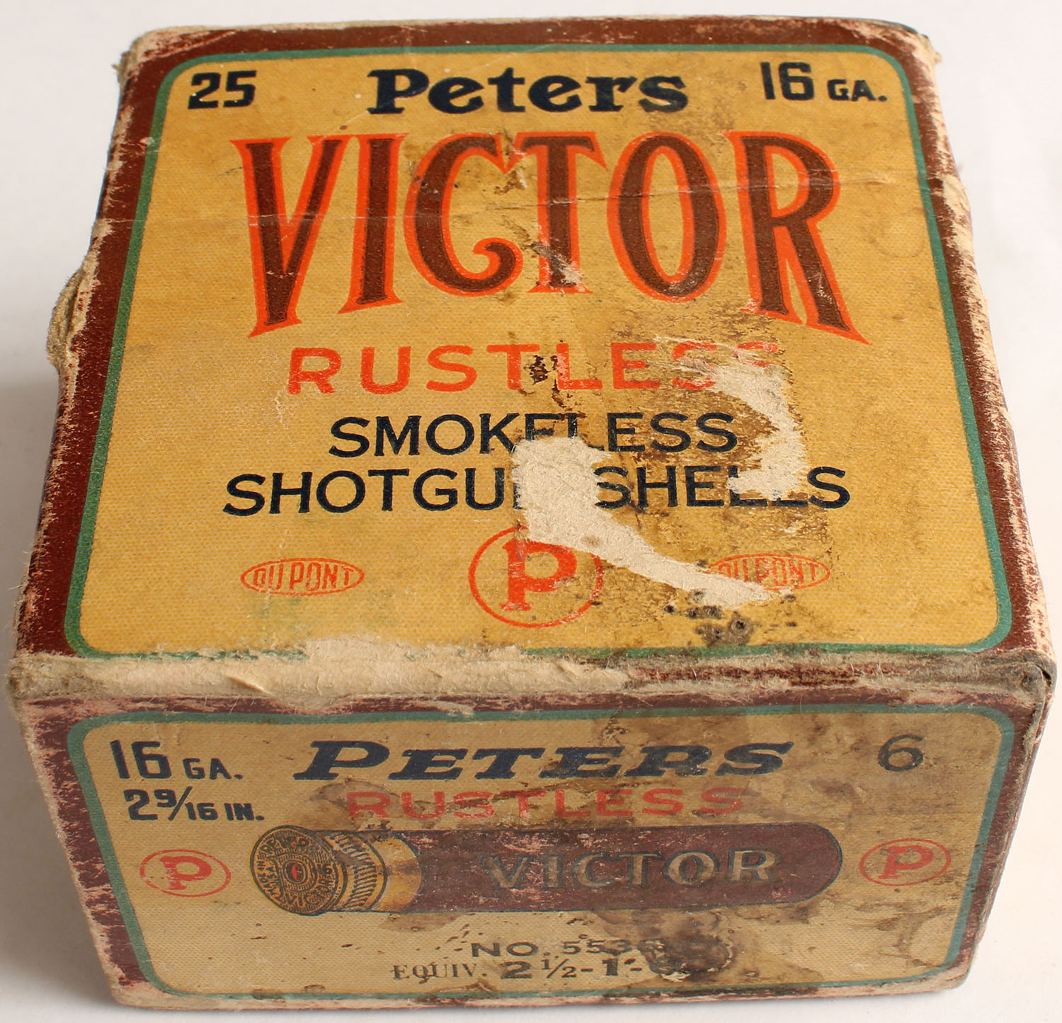 Peters Cart. Div., Victor, Rustless, 16ga., 2 9/16'', 1pc., Full with 1rd being fired, shot size 6, maroon, cream & orange box, box is solid with soiling, edge wear & scuffing, box has okay colors, Shells are good. Grade: Good + - Value: 10 to 40