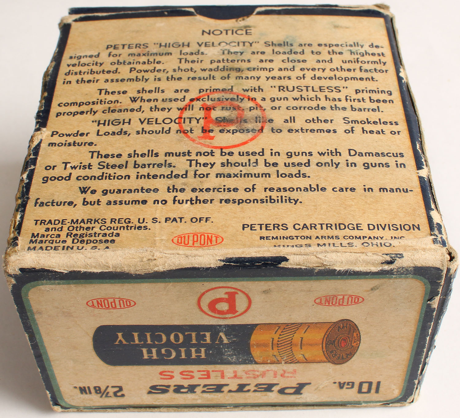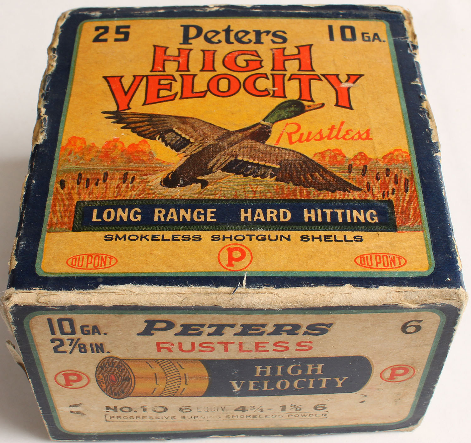 Peters Cart. Div., Kings Mills, OH, High Velocity, 10ga., 2 7/8'', 1pc., Full, shot size 6, multi colored box that pictures mallard flying out of the marsh grass, box has edge wear, tape repair & light soiling, box has very nice colors, shells are excellent. Grade: Very Good ++ - Value: 40 to 120