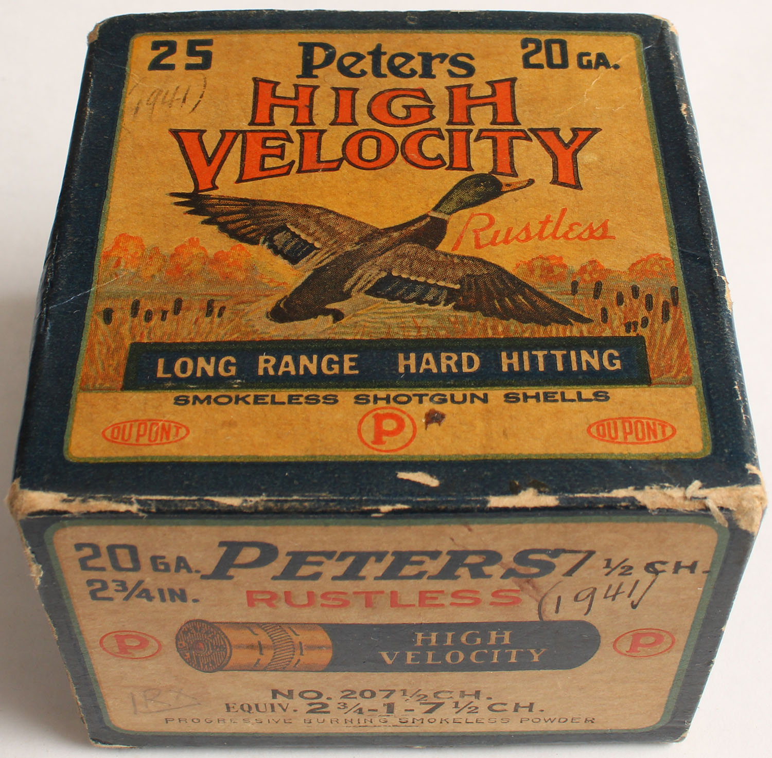 Peters Cart. Div., King Mills, OH, High Velocity, 20ga., 2 3/4'', 1pc., Partial 5rds, shot size 7 1/2 CH, multi colored box that pictures mallard flying out of the marsh grass, box has light edge wear & age soiling, box has nice colors, shells are excellent. Grade: Very Good ++ - Value: 10 to 40