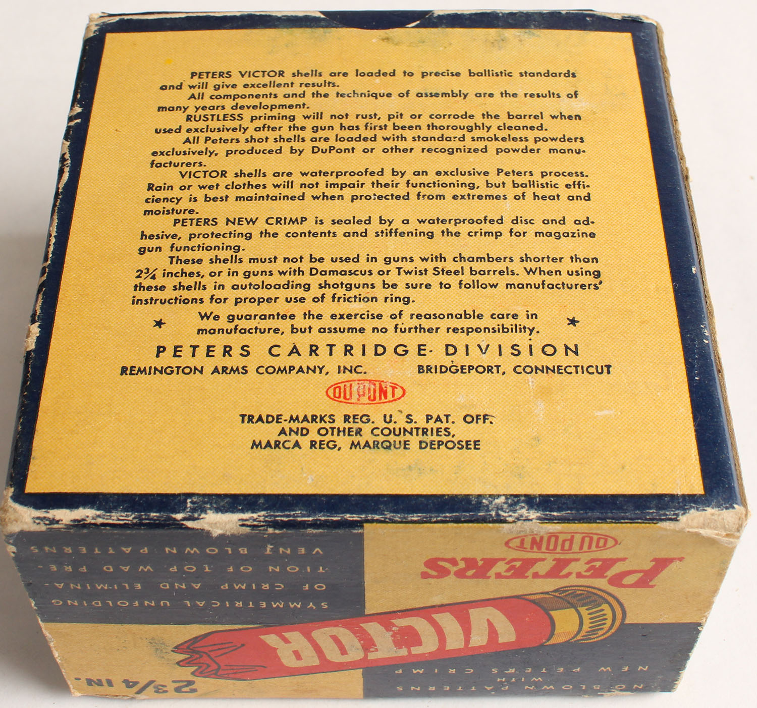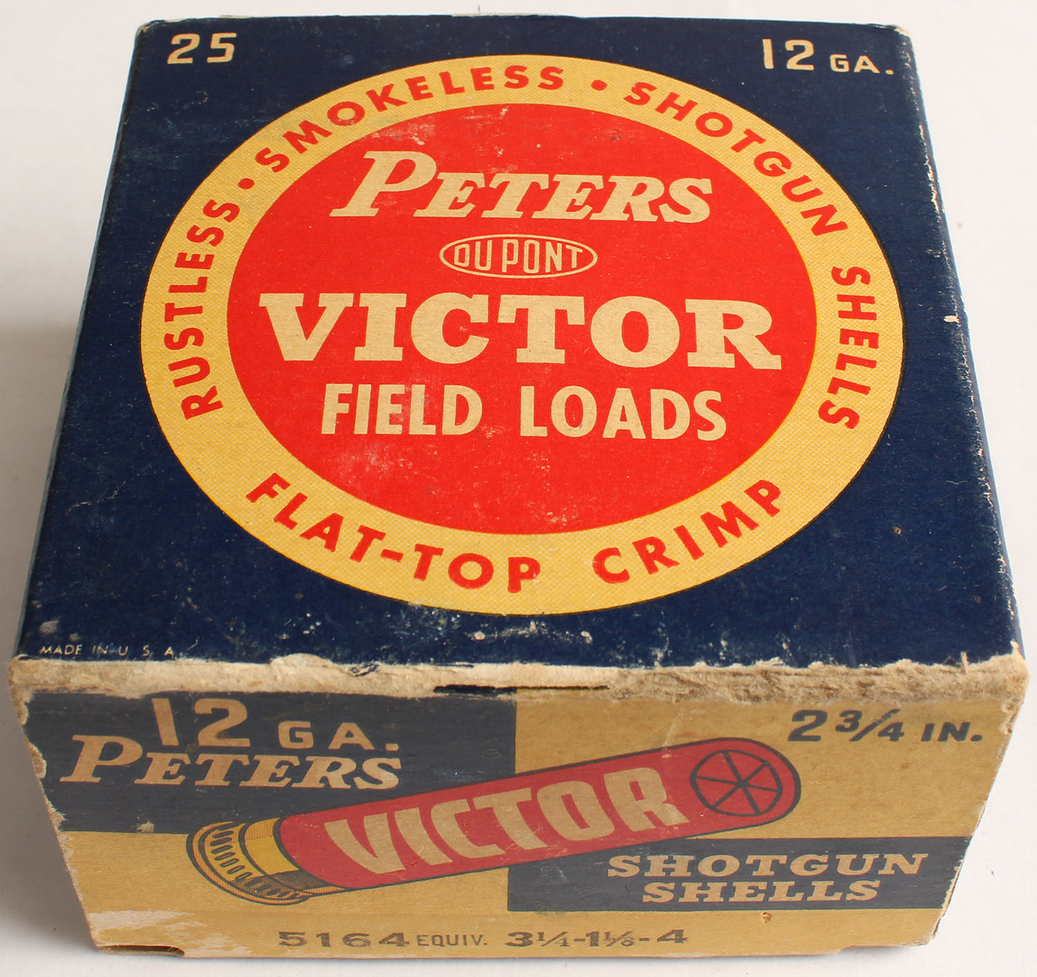 Peters Cart. Div., Victor Field Loads, 12ga., 2 3/4'', 1pc., Full, shot size 4, blue, red & buff colored box, box has light edge wear with great colors, shells are excellent. Grade: Excellent - Value: 20 to 60