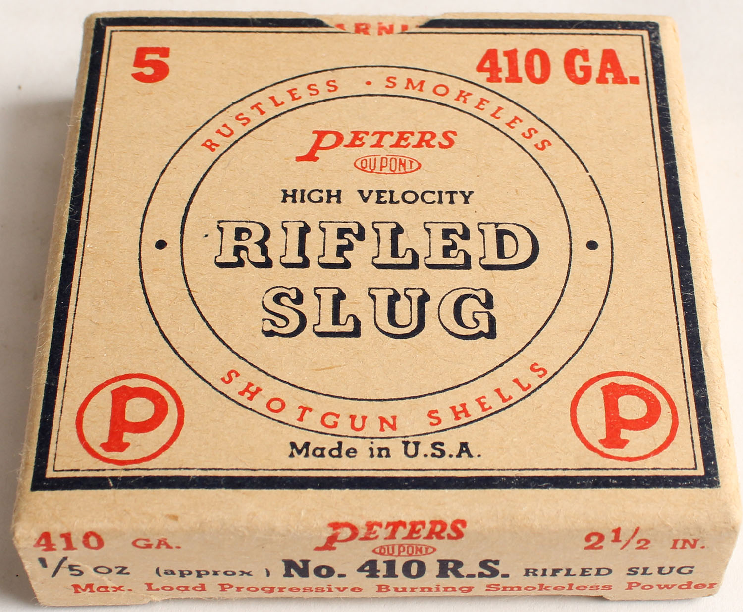 Peters Cart. Div., 410ga., 2 1/2'', 1pc., Full, shot size Rifled Slug , blue, orange & buff colored box, box is very solid with great colors, shells are excellent. Grade: Excellent + - Value: 10 to 40