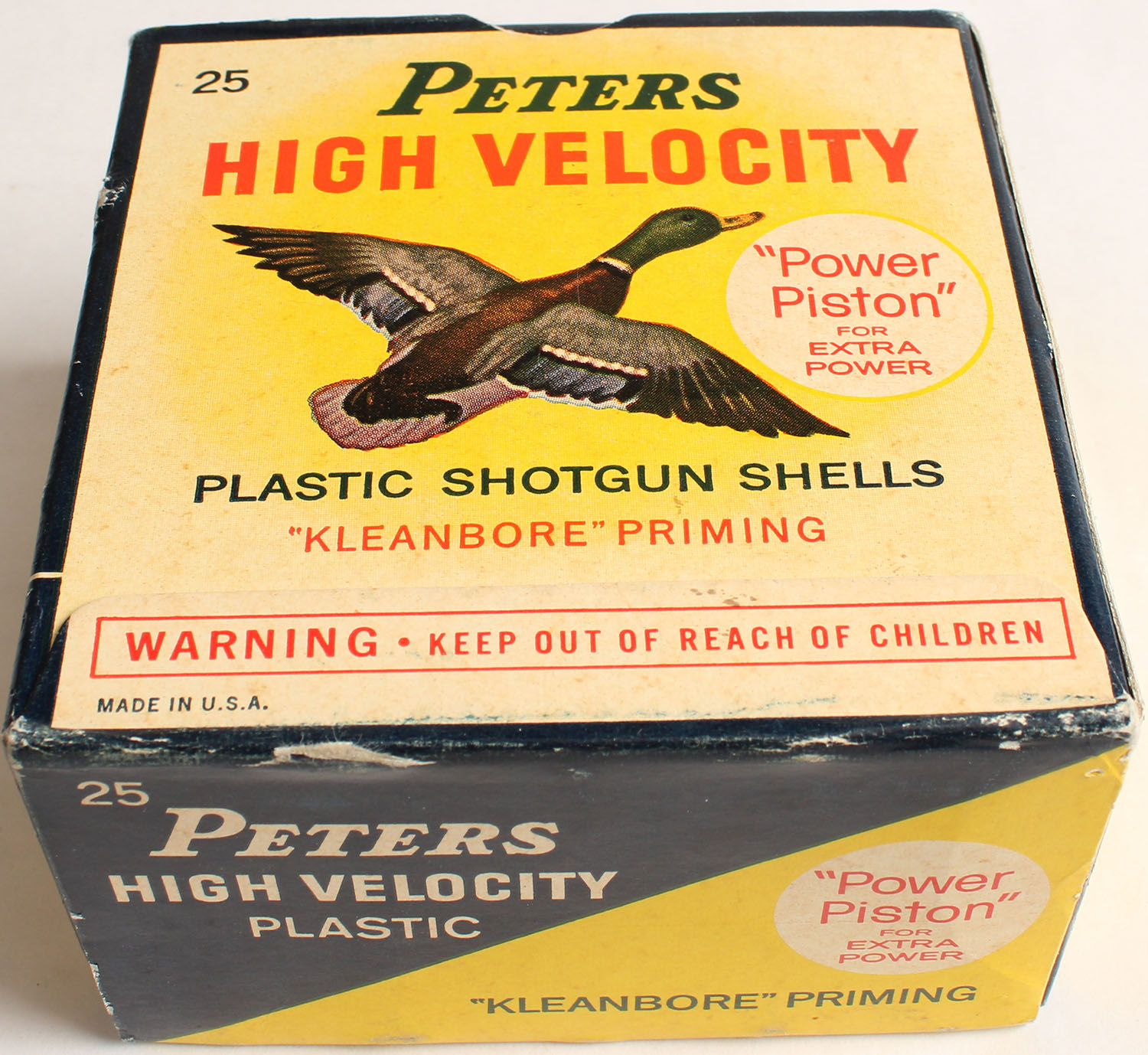 Peters Cart. Div., High Velocity, 12ga., 2 3/4'', 1pc., Full, shot size 7 1/2, multi colored box that pictures mallard flying, box is very solid with great colors, shells are excellent. Grade: Excellent - Value: 10 to 40