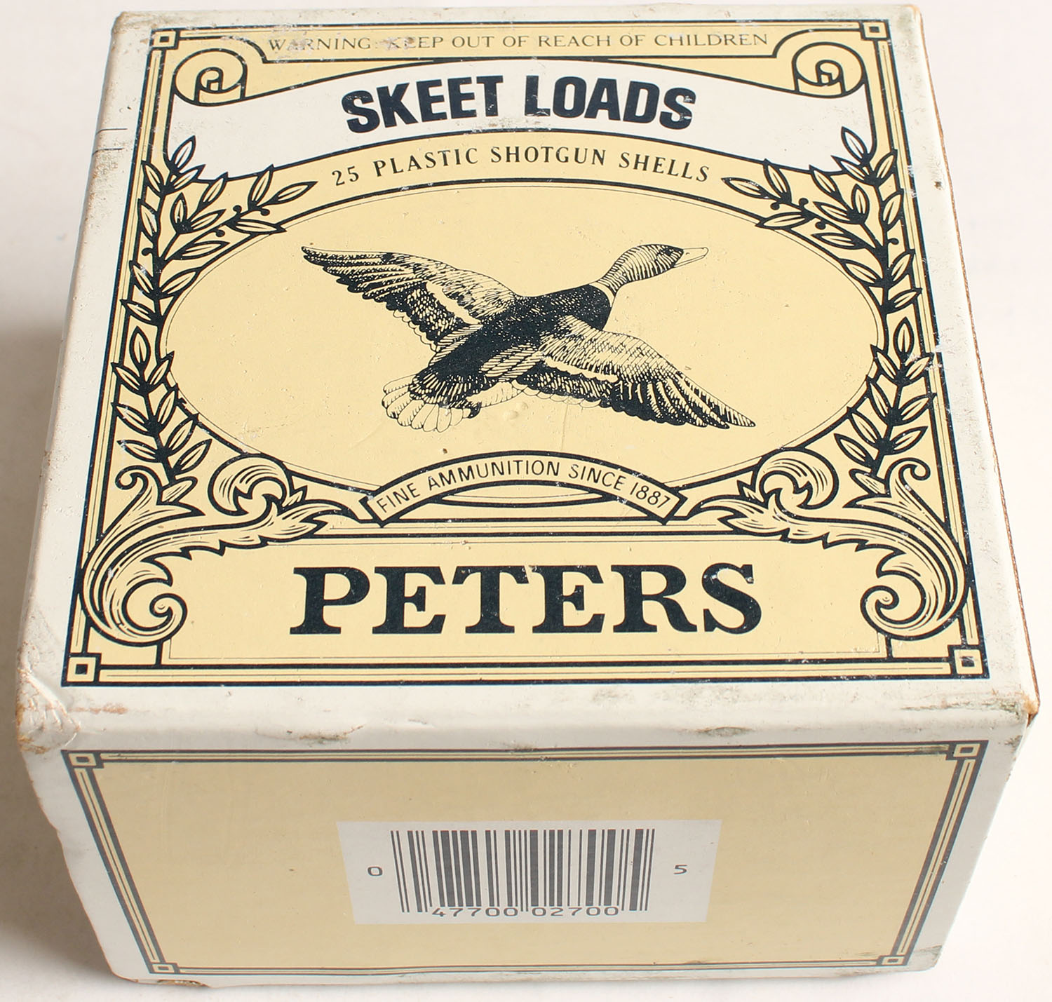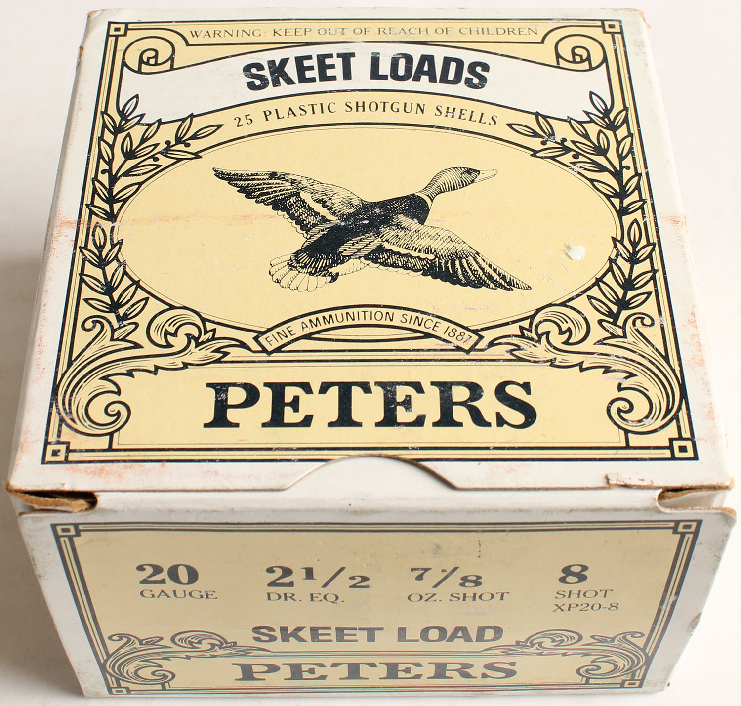 Peters Cart. Div., Skeet Loads, 20ga., 2 3/4'', 1pc., Full, shot size 8, multi colored box, box has great colors, shells are excellent. Grade: Excellent - Value: 10 to 30