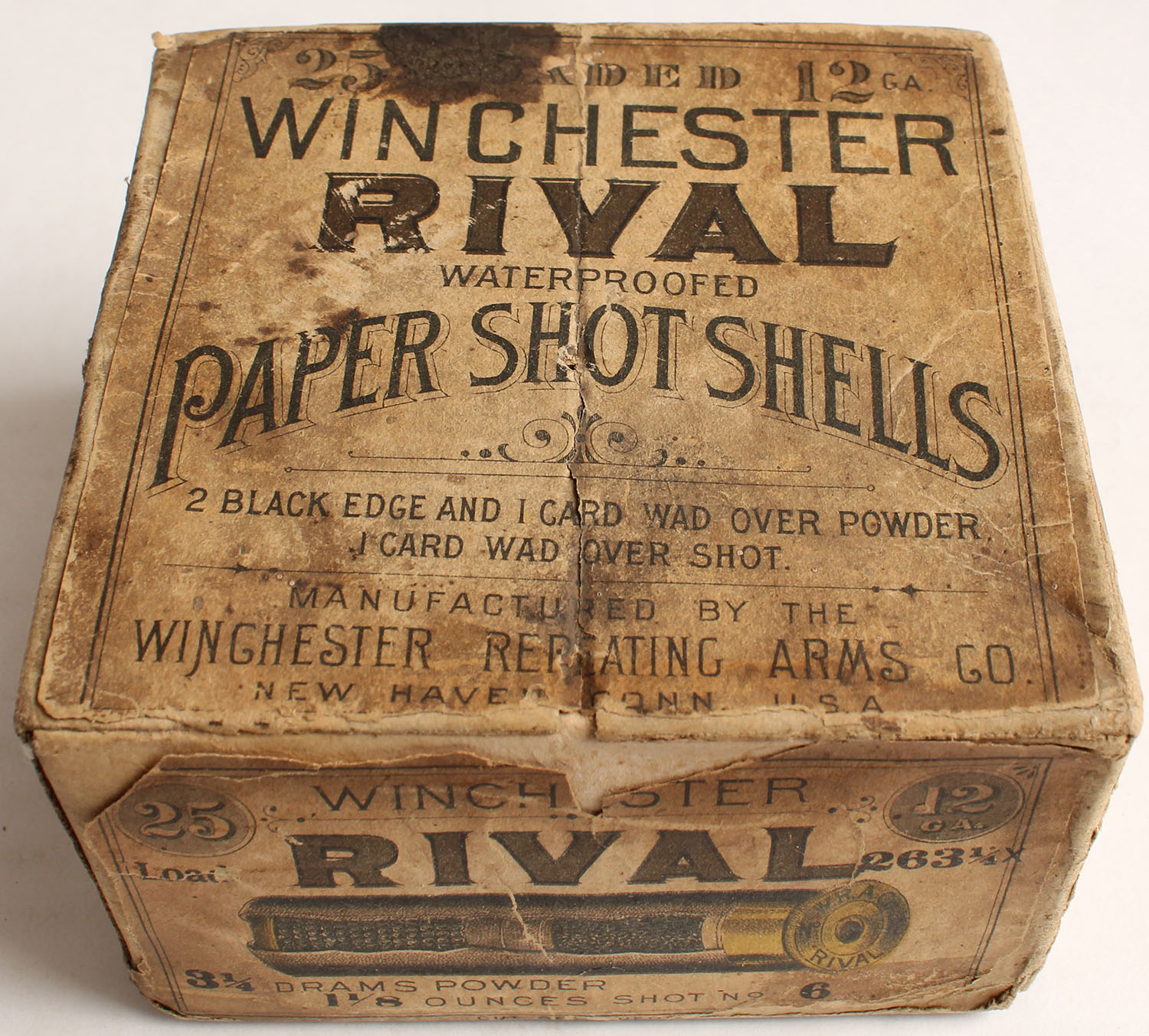 RARE!!! Winchester, RIVAL, 12ga., 2pc., Empty, shot size 6, buff box with buff & brown label, has rare CUT-A-WAY shot shell on side, box has seam splits, age soiling, edge wear, light scuffing & label is 95% intact, HARD TO FIND BOX! Grade: Very Good - Value: 100 to 500