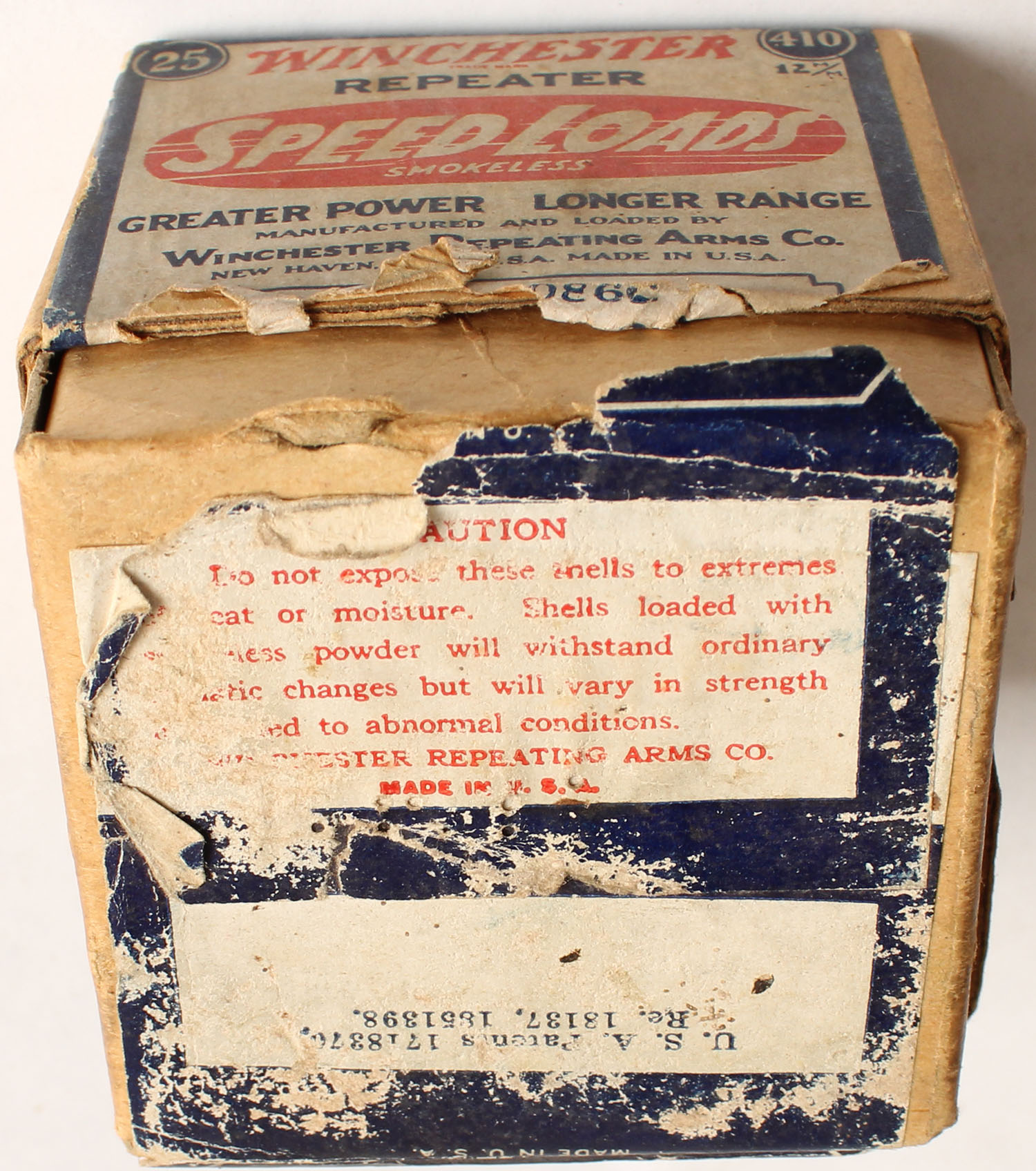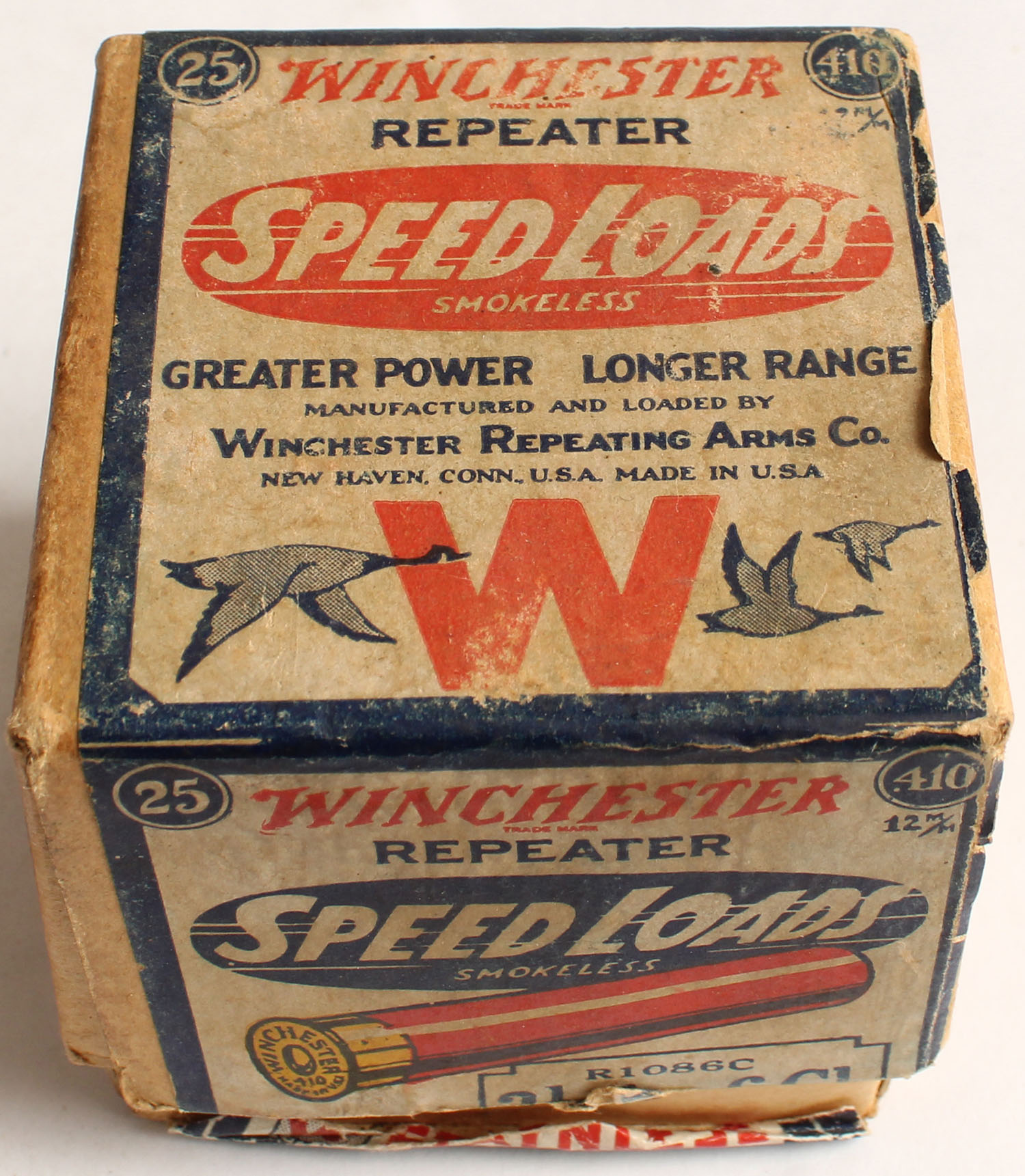 Winchester REPEATER Speed Loads, 410ga, 2pc., Partial 5rds all have dented primers, shot size 6 Ch, buff box with dark blue, red & white paper label, box is solid with scuffing, age soiling & nice color to label, RARE with the REPEATER markings, Shells are good. Grade: Very Good + - Value: 200 to 600