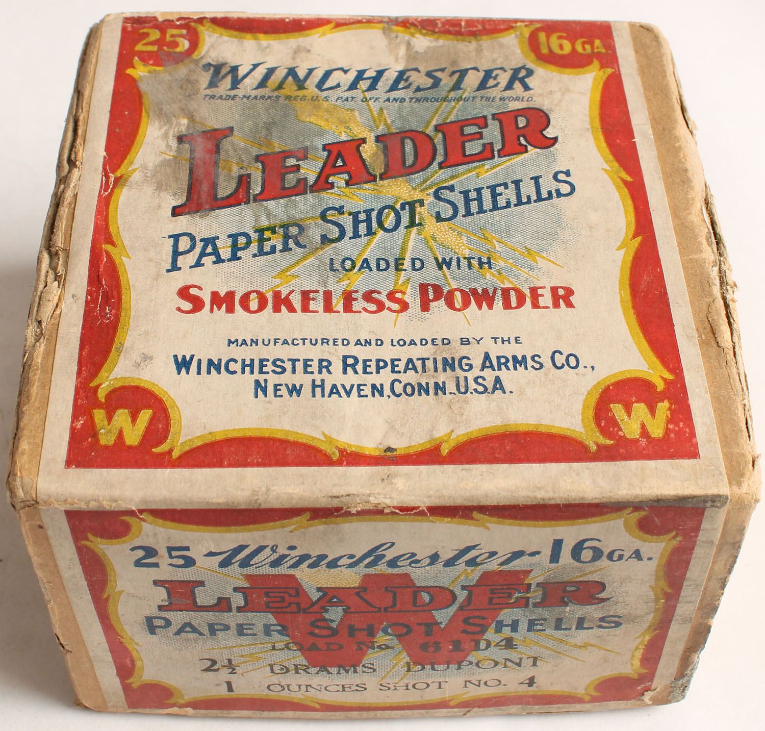 Winchester, LEADER with Insert picturing clay pigeon shooters that says ''No Closed Season on Clay Birds'', 16ga, 2pc., Full, shot size 4, Buff box with red, yellow, white & black label showing lightning bolt, box has edge wear, scuffing, seam splits, tape repair & soiling with nice color to label, label is 90% intact, Shells are good. Grade: Very Good - Value: 100 to 500