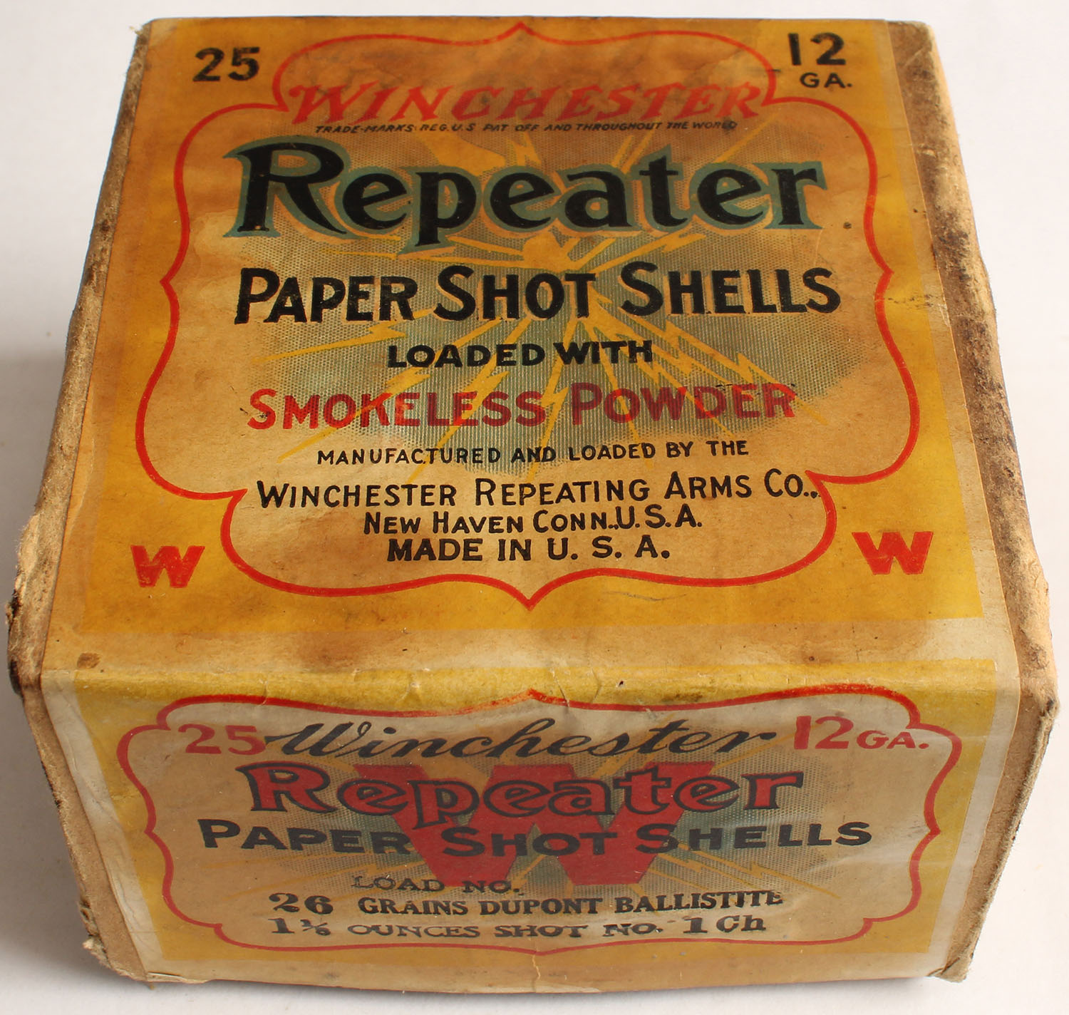 Winchester, REPEATER, 12ga, 2pc., Full of mixed shot sizes, Shot size 1 Ch, Buff box with yellow, white & red label showing lightning bolt, box has age soiling, edge wear & shell protrusions, shells are fair. Grade: Good + - Value: 20 to 100