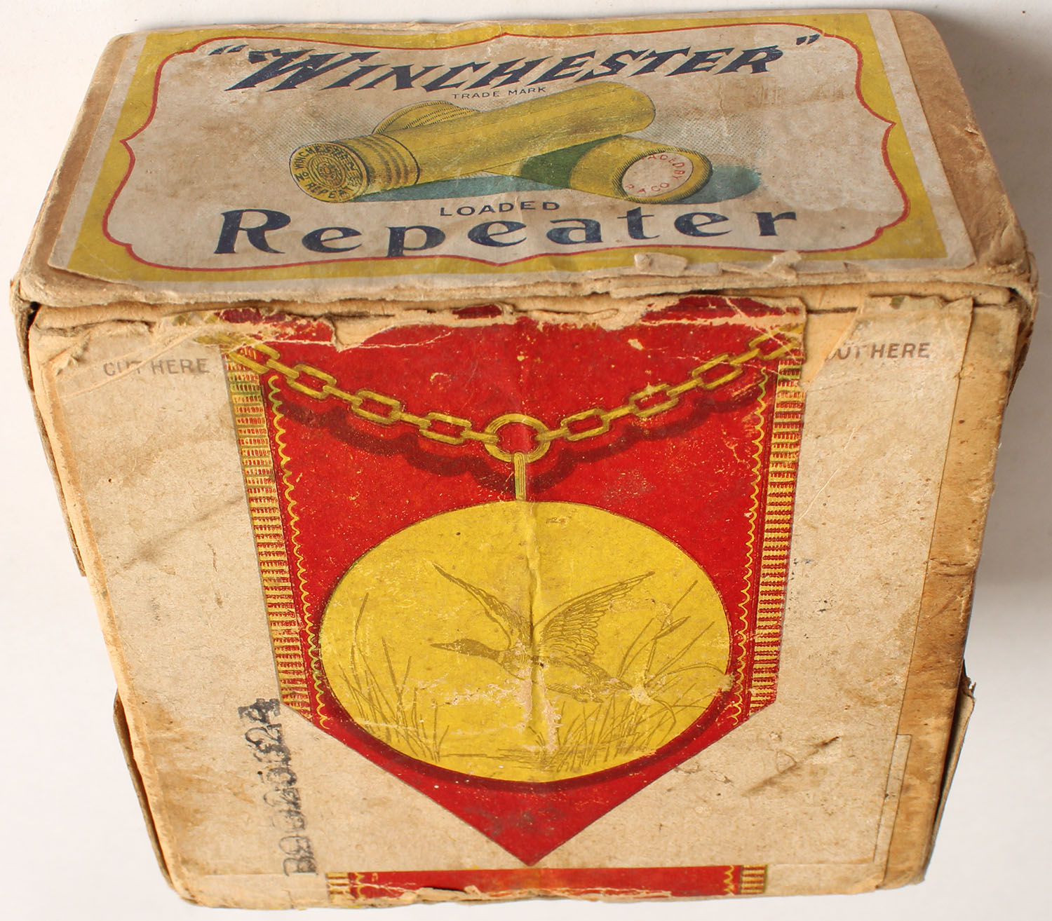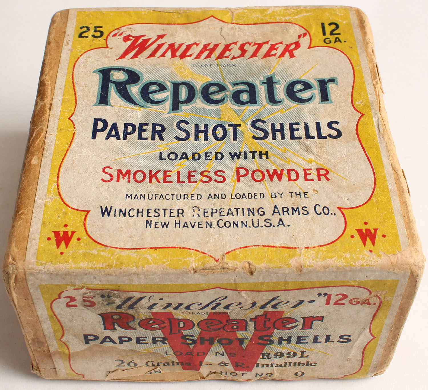 Winchester, REPEATER, 12ga, 2pc., Empty, Shot size 9, Buff box with yellow, white & red label showing lightning bolt, box has light soiling, edge wear & incorrect UMC bottom. Grade: Very Good + - Value: 20 to 100