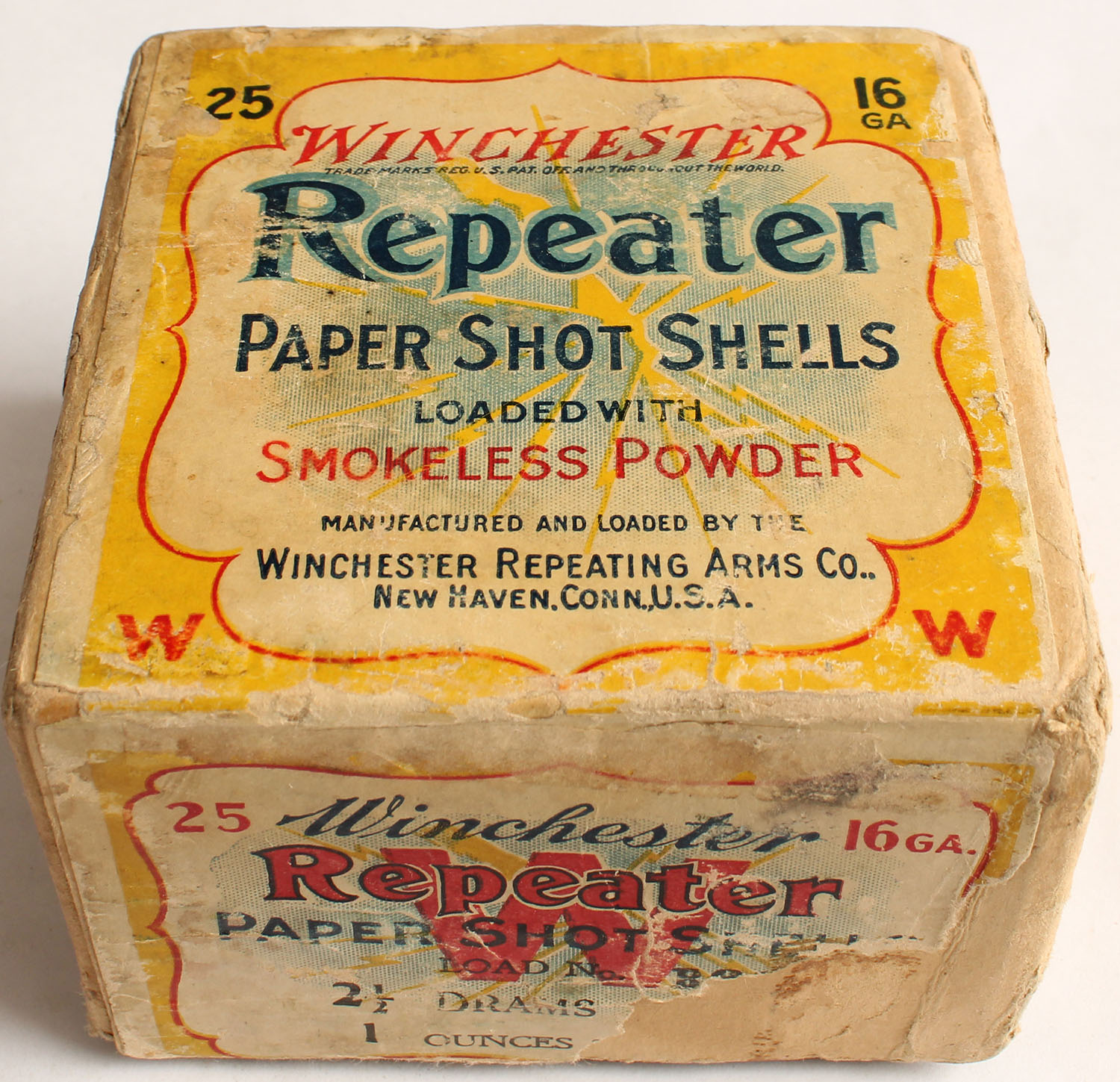 Winchester, REPEATER, 16ga, 2pc., Partial 20rds with 2rds being different shot size, Shot size unknown, Buff box with yellow, white & red label showing lightning bolt, box has seam split, edge wear, light soiling & tears in label & box, Shells are good. Grade: Very Good + - Value: 20 to 200
