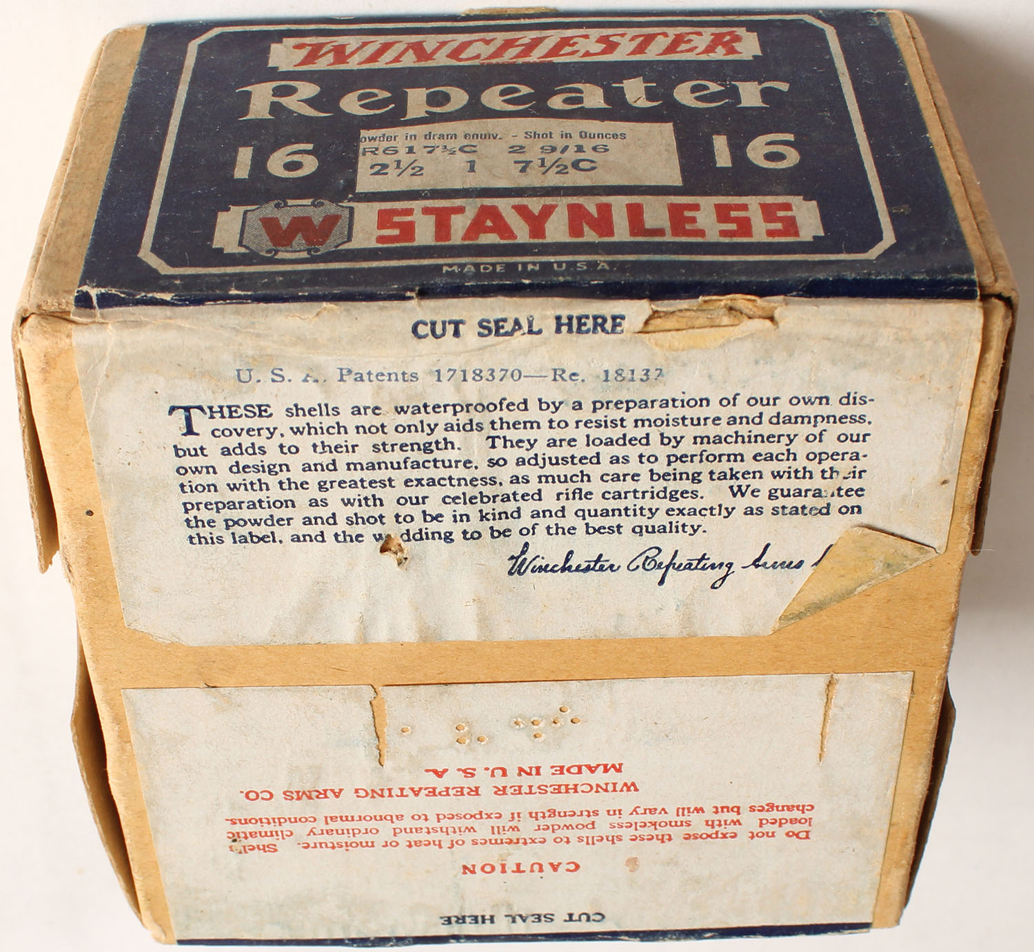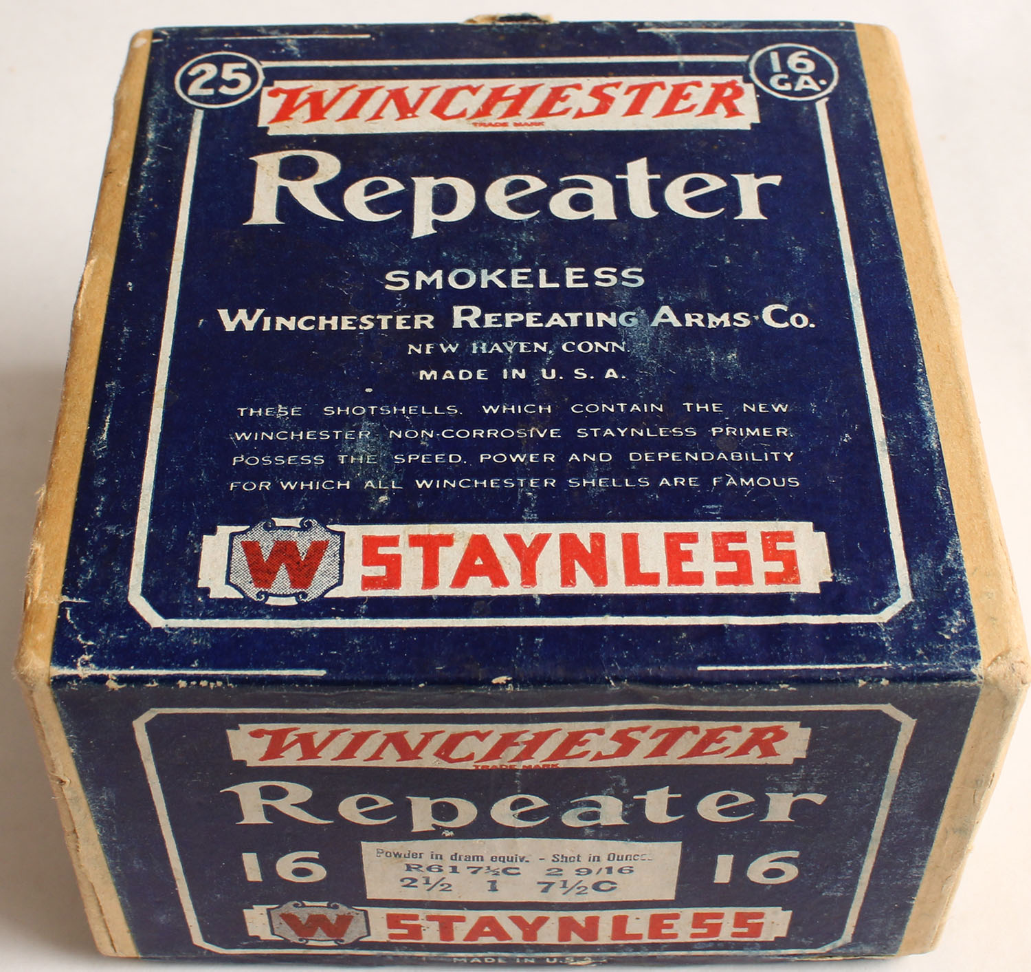 Winchester, Repeater, 16ga., 2pc., 2 9/16'', FULL & SEALED, Shot size 7 1/2C, buff box with blue, red & white colored label, box has light soiling & small shell protrusions with great colors. Grade: Excellent - Value: 40 to 200