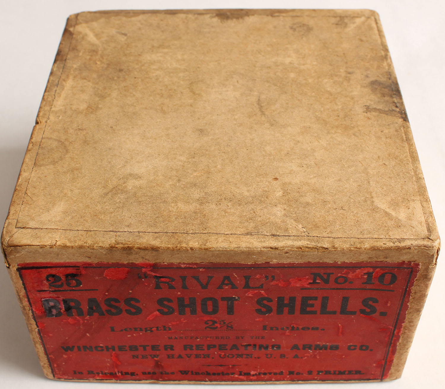 Winchester, Rival, Brass Shot Shells, 10ga., 2pc., 2 5/8'', Partial 1rd, buff box with red & black colored end label, box has soiling & scuffing with nice colors. Grade: Very Good ++ - Value: 100 to 400