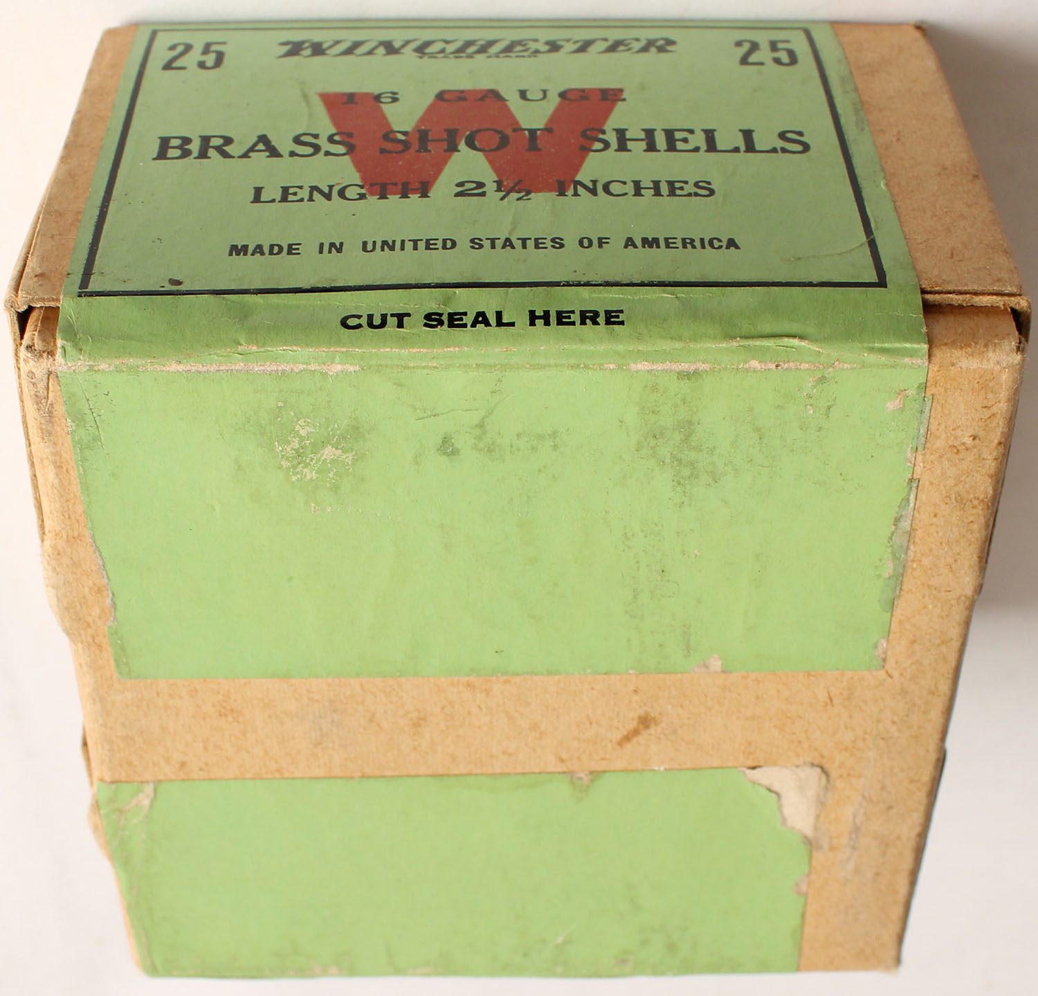 Winchester, BRASS SHOT SHELLS, 16ga., 2pc., 2 1/2'', FULL & SEALED, buff box with green, red & black label, box is very solid & has small shell protrusions with Minty colors to label. Grade: Excellent + - Value: 200 to 600