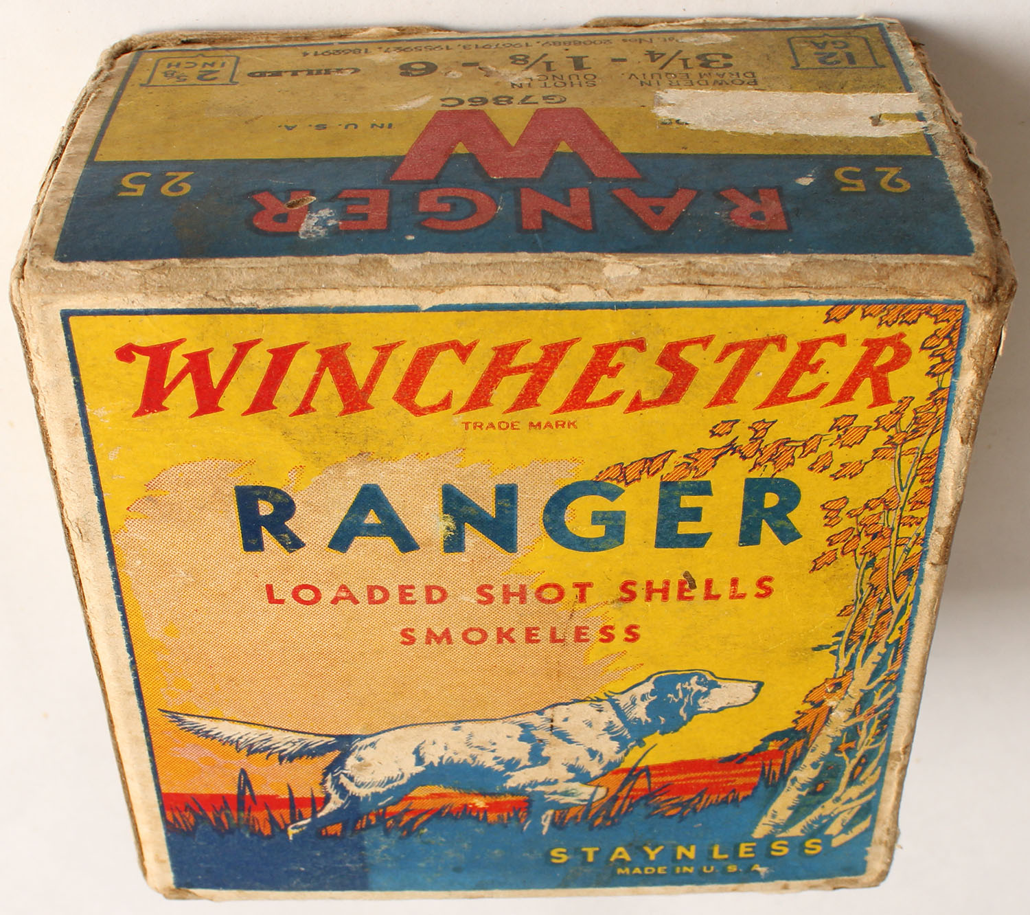 Winchester, Ranger, 12ga, 1pc., 2 5/8'', Partial 19rds with 4rds being Western, Shot Size 6 Chilled, multi colored box with dog on point, box has age soiling, torn inside top flap, edge wear & scuffing with nice colors, shells are good. Grade: Very Good + - Value: 20 to 60