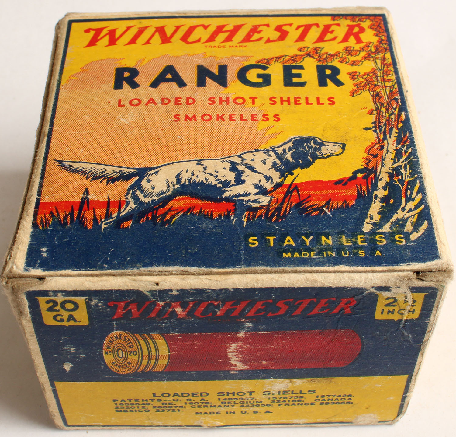 Winchester, Ranger, 20ga, 1pc., 2 1/2'', Empty, Shot Size 6, multi colored box with dog on point, box has light edge wear & light scuffing with great colors. Grade: Very Good ++ - Value: 20 to 60