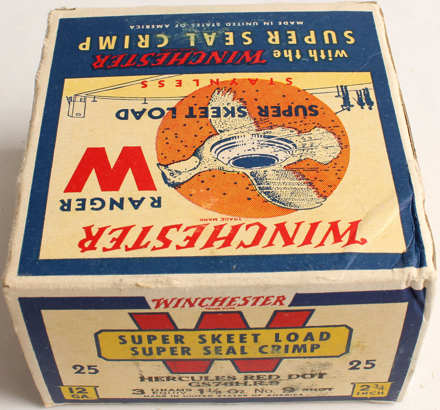 Winchester, Ranger Super Skeet Load, Hercules Red Dot, 12ga, 1pc., 2 3/4'', Full, White, blue & red box that pictures flying Quail with skeet in body & shot all around, Loading: 3 Drams, 1 1/8 Oz., No. 9 Shot, Box is very solid with light edge wear & great colors, Shells are excellent. Grade: Excellent ++ - Value: 50 to 150