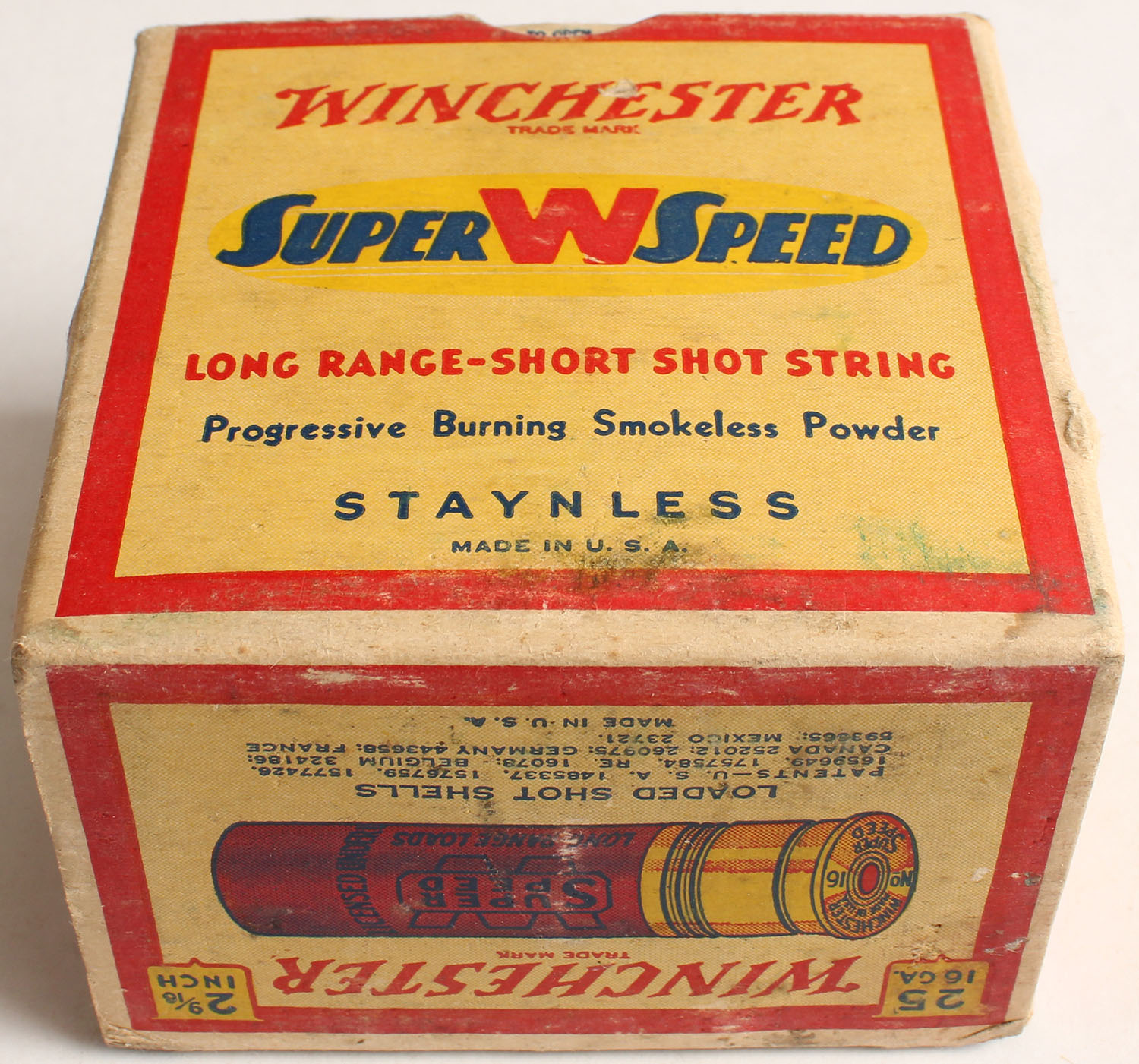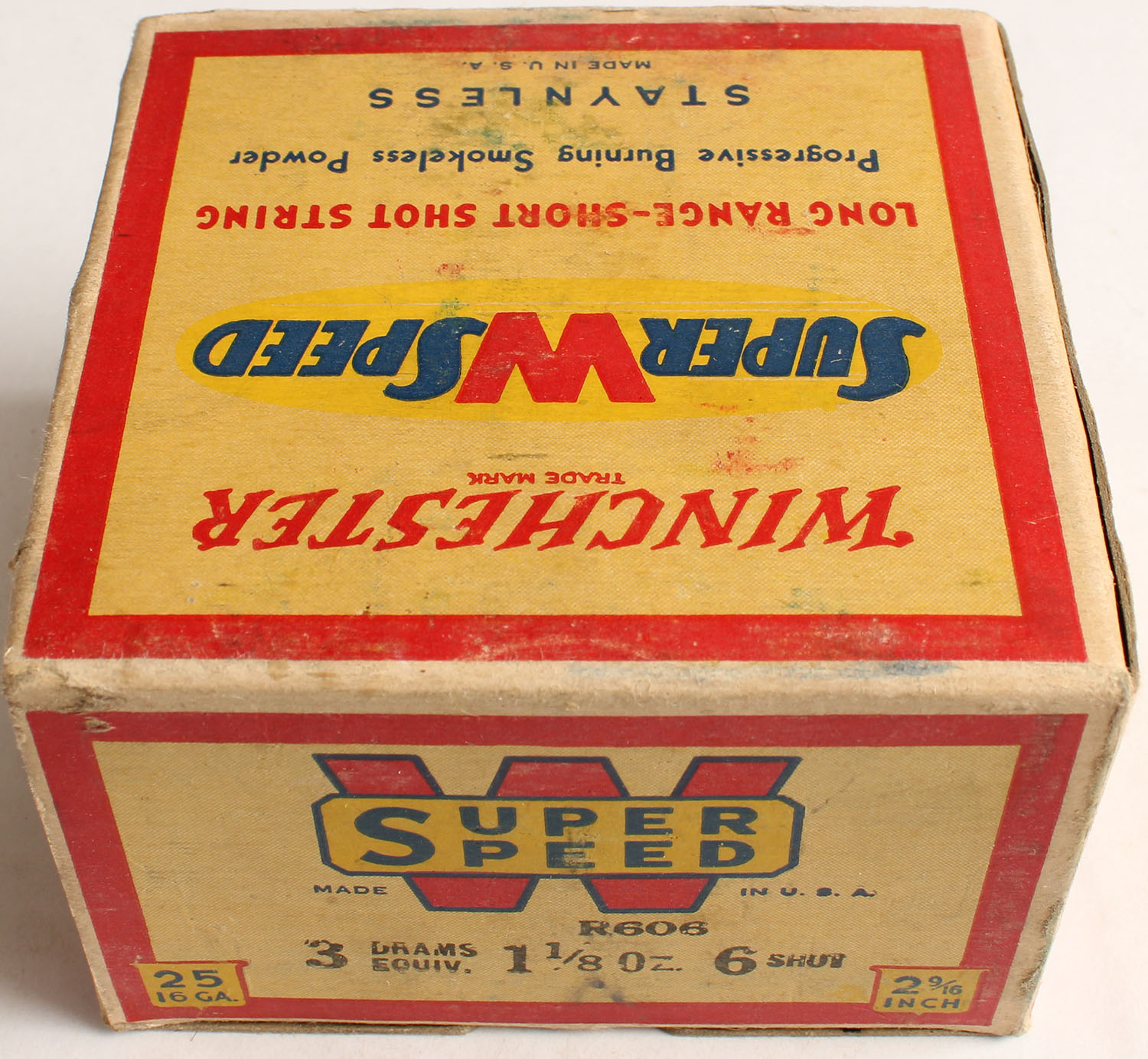 Winchester, Super W Speed, Staynless, 16ga., 2 9/16'', 1pc., Full, shot size 6, cream red, blue and yellow box, box is solid with nice colors, box has light soiling & light edge wear, shells are excellent. Grade: Very Good ++ - Value: 20 to 60