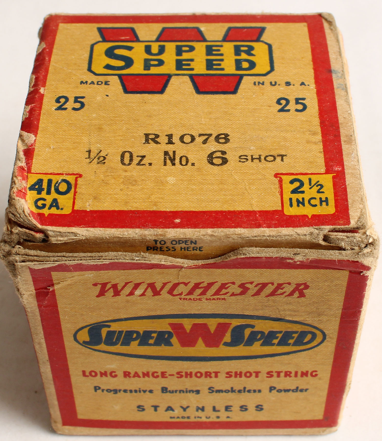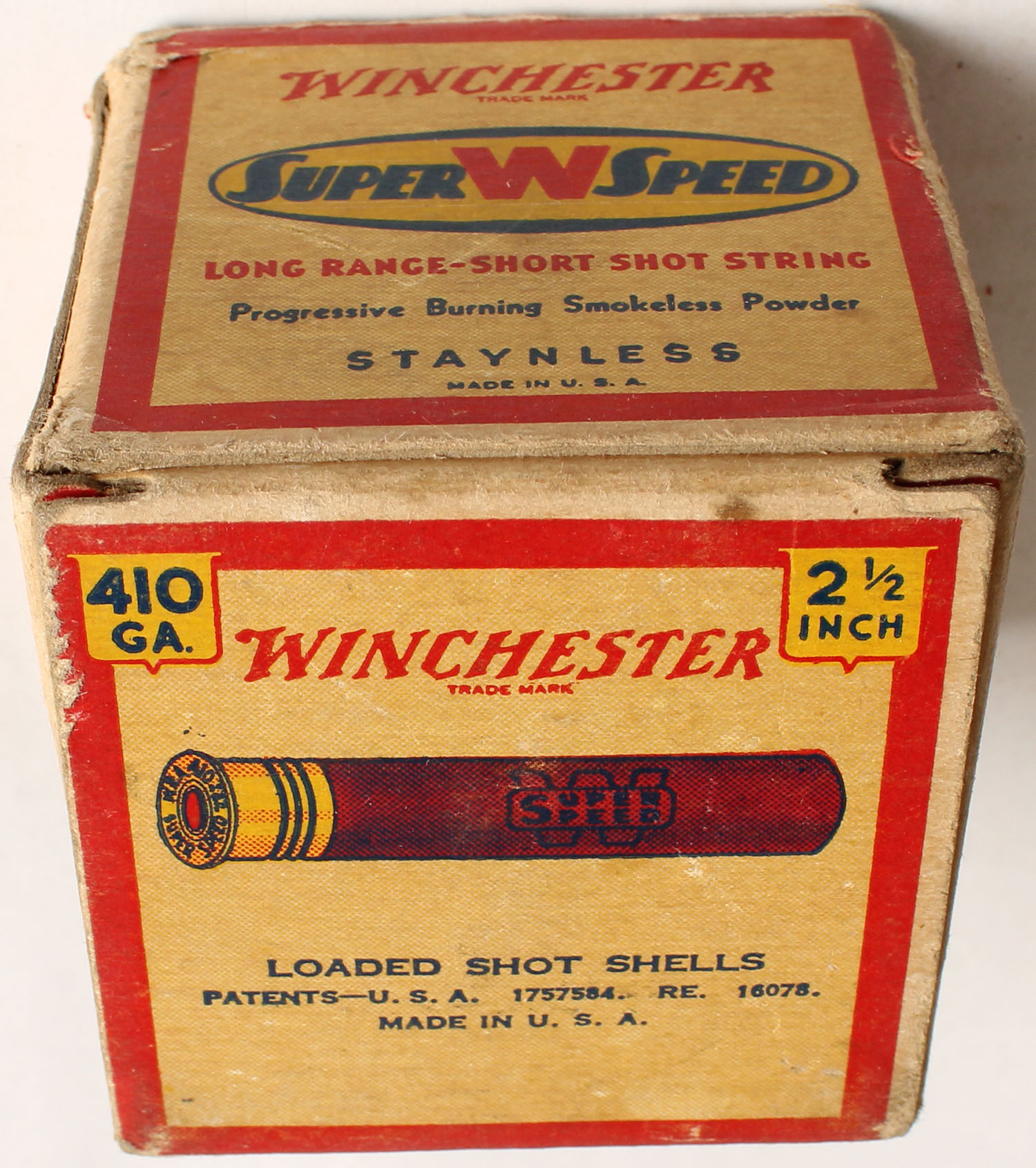 Winchester, Super W Speed, Staynless, 410ga., 2 1/2'', 1pc., Full with 16rds being correct brand, shot size 6, cream red, blue and yellow box, box has edge wear & very nice colors, shells are good. Grade: Very Good ++ - Value: 20 to 60