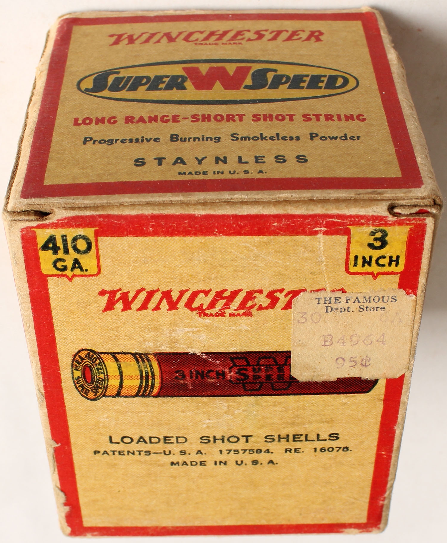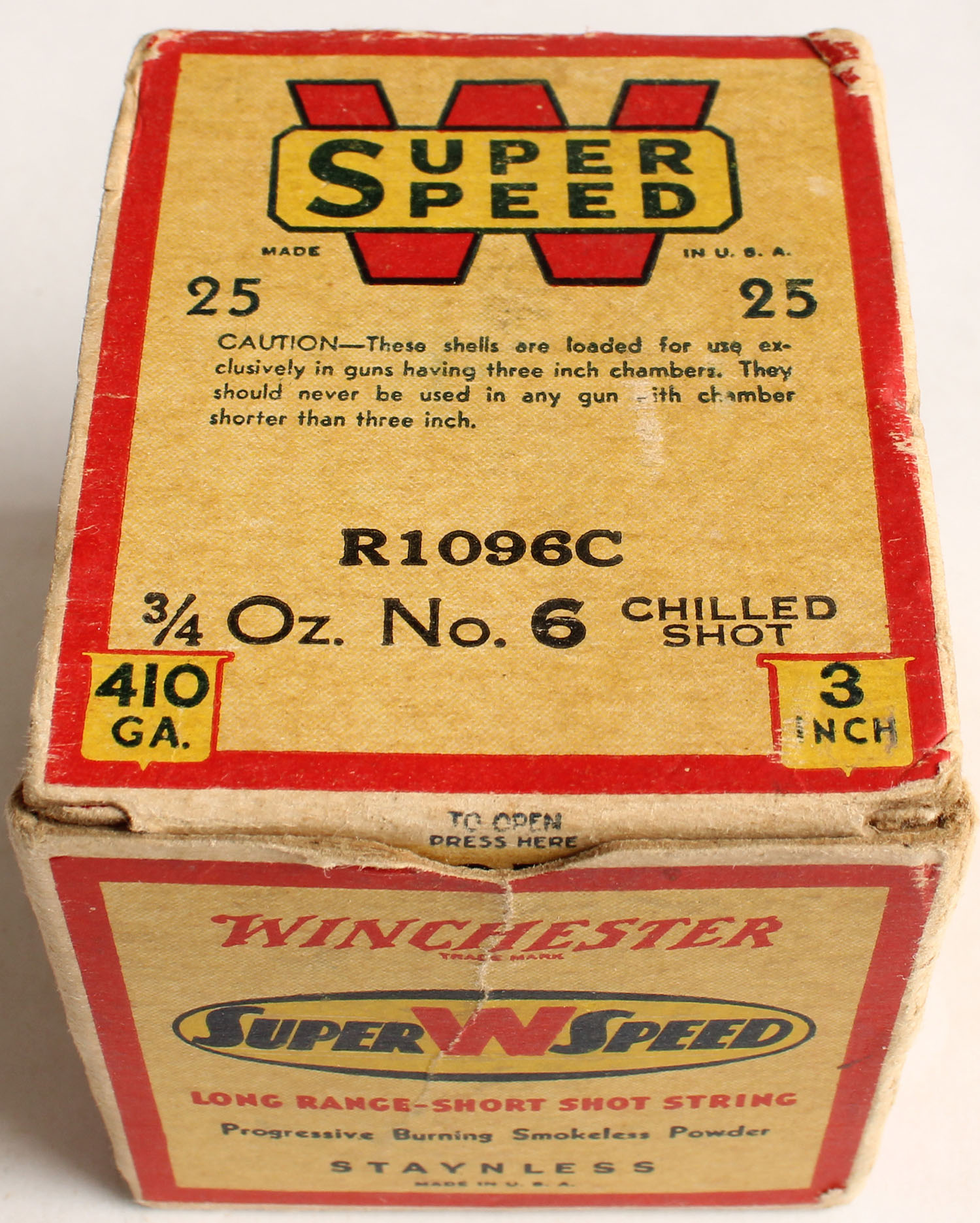 Winchester, Super W Speed, Staynless, 410ga., 3'', 1pc., Partial 23rds, shot size 6 Chilled, cream red, black and yellow box, box has edge wear, light scuffing & very nice colors, shells are excellent. Grade: Very Good ++ - Value: 20 to 60