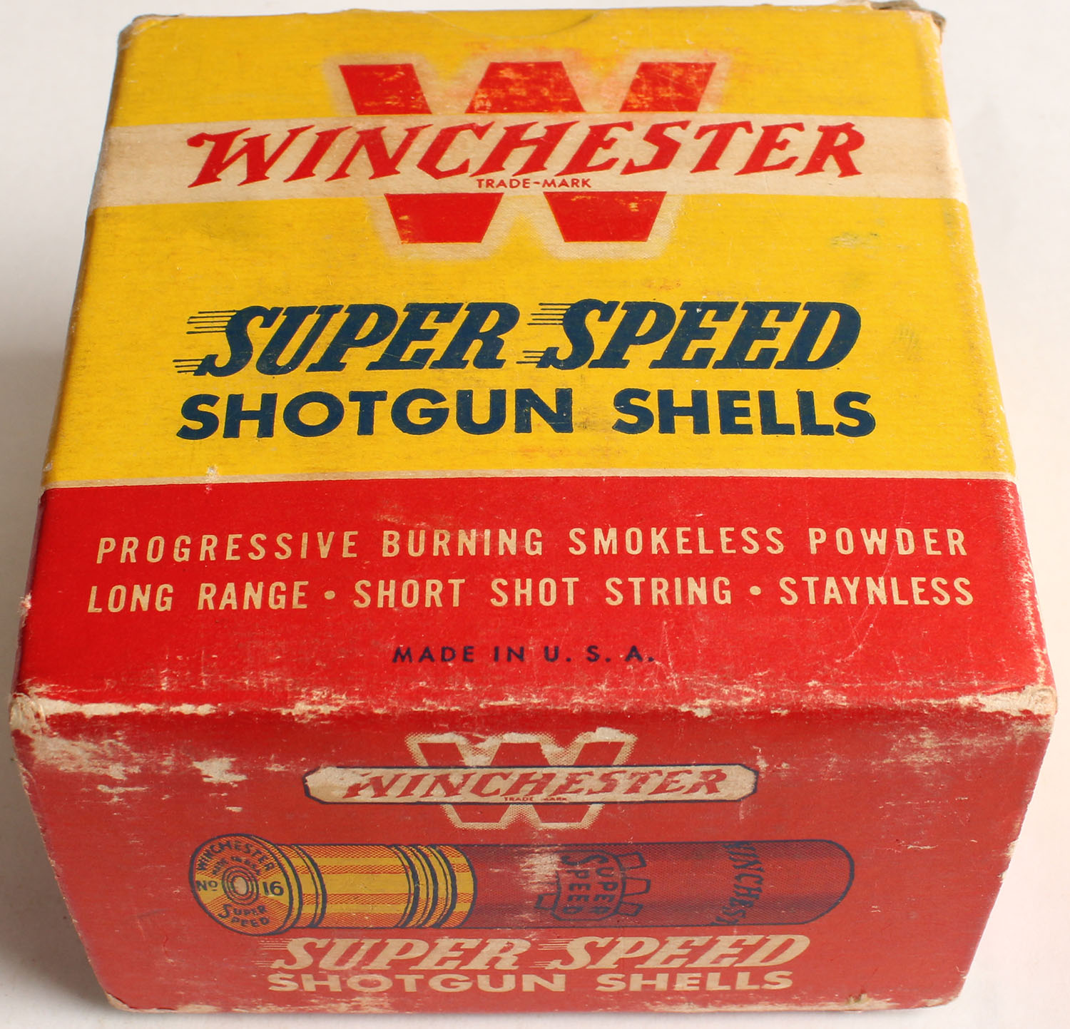 Winchester, Super Speed, 16ga., 2 9/16'', 1pc., Full, shot size 6, red, black and yellow box, box has light edge wear, light soiling & scuffing with very nice colors, shells are good but swollen. Grade: Very Good ++ - Value: 10 to 40