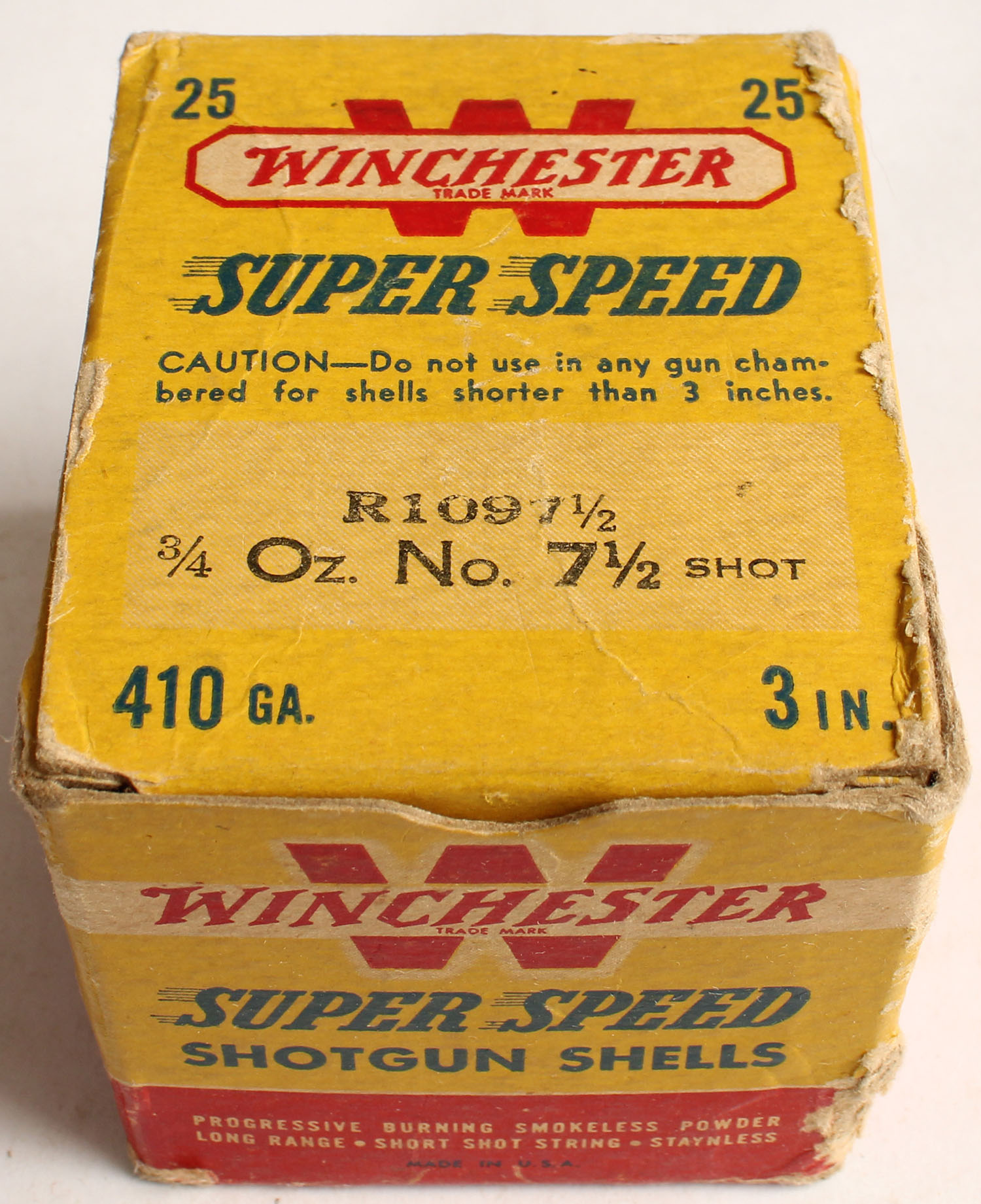 Winchester, Super Speed, 410ga., 3'', 1pc., Full, shot size 7 1/2, red, black and yellow box, box has edge wear, light age soiling & inside top flap is torn with very nice colors, shells are excellent. Grade: Very Good ++ - Value: 10 to 40