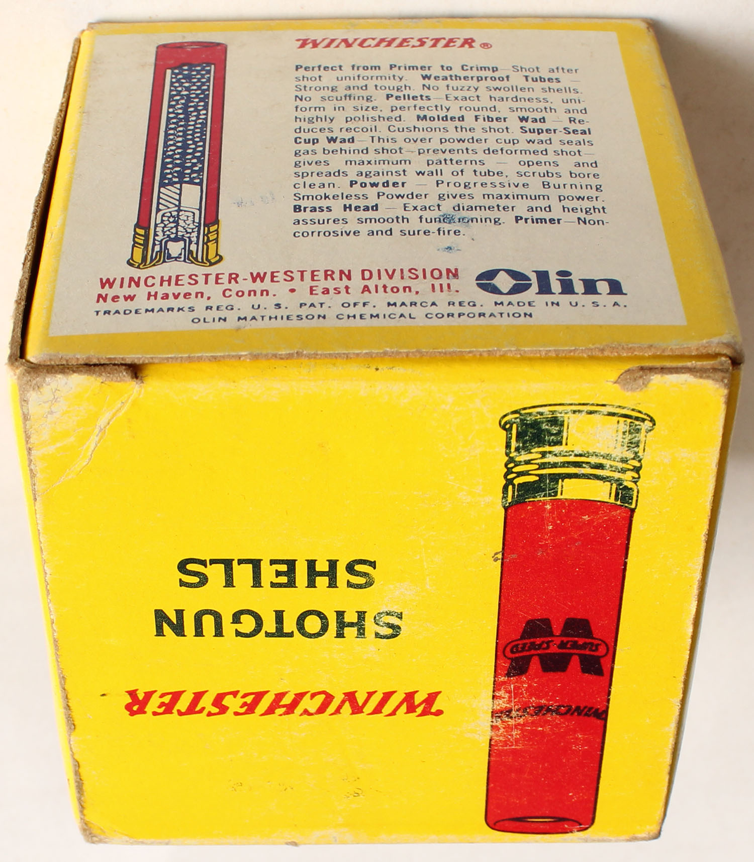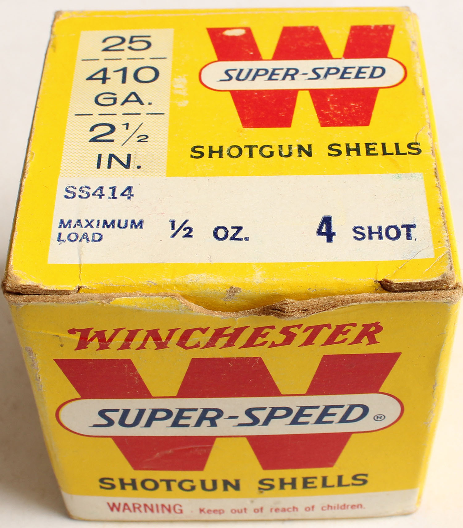 Winchester, Super Speed, 410ga., 2 1/2'', 1pc., Full, shot size 4, red, white & yellow box, box has light soiling & light edge wear with very nice colors, shells are excellent. Grade: Very Good ++ - Value: 10 to 40