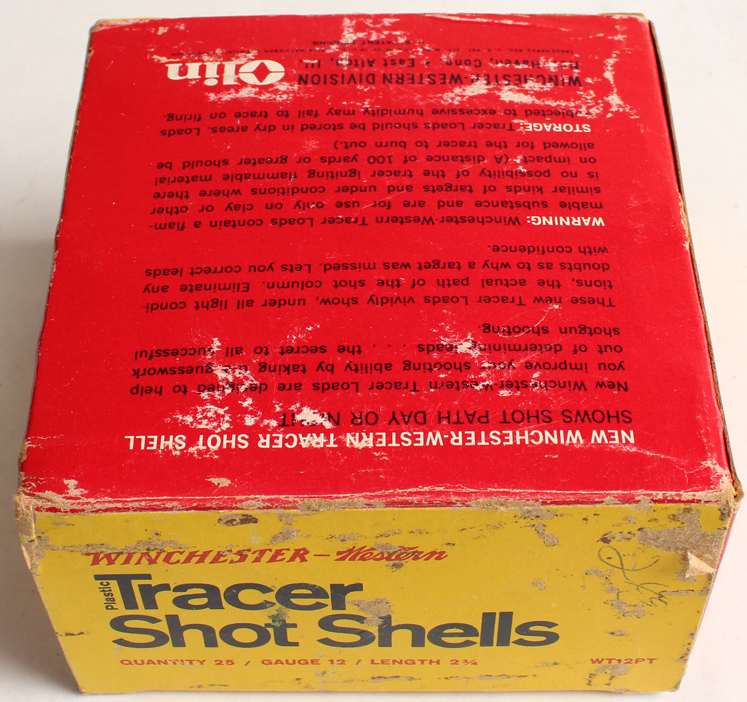 Winchester-Western, Tracer Shot Shells, Visible Day or Night, 12ga., 2 3/4'', 1pc., Full, shot size 8, multi-colored box, box has light edge wear & scuffing with nice colors, shells are very good. Grade: Very Good ++ - Value: 10 to 50