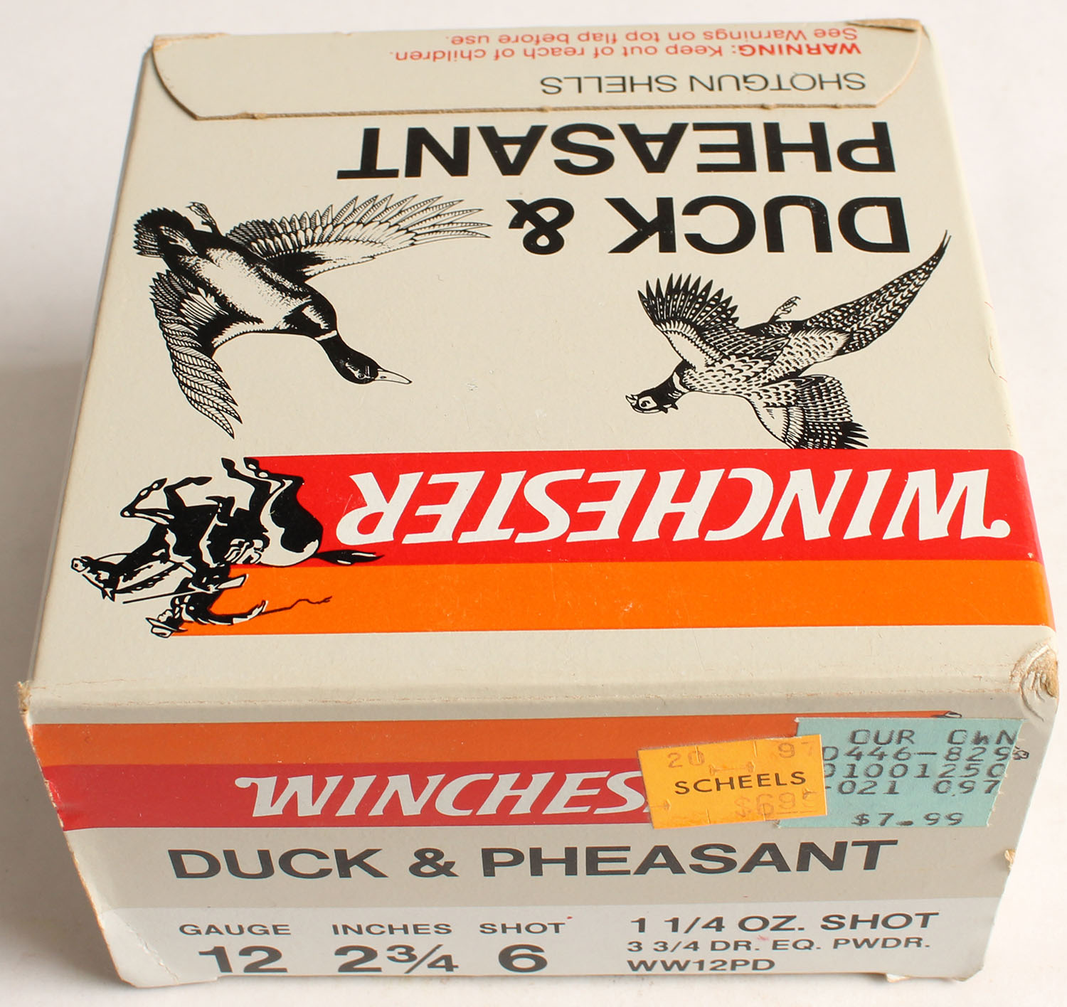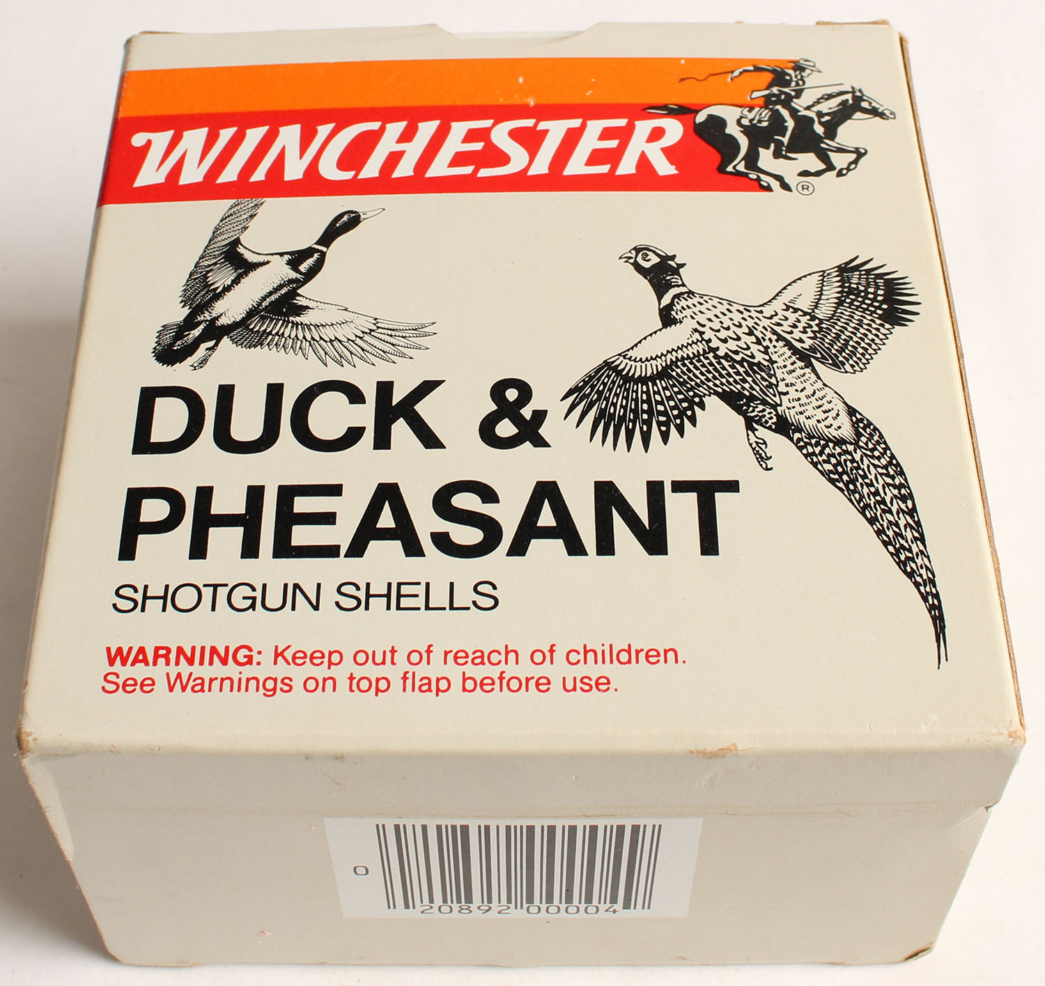 Winchester, Duck & Pheasant, 12ga., 2 3/4'', 1pc., Full, shot size 6, multi-colored box, box is very solid with great colors, shells are excellent. Grade: Excellent + - Value: 10 to 30