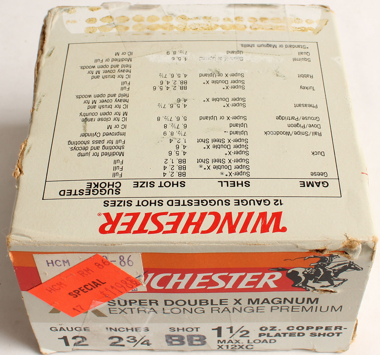 Winchester, Super Double X Magnum, 12ga., 3'', 1pc., Full, shot size BB, multi-colored box, box has seam split, edge wear & scuffing with good colors, shells are very good. Grade: Very Good + - Value: 10 to 30