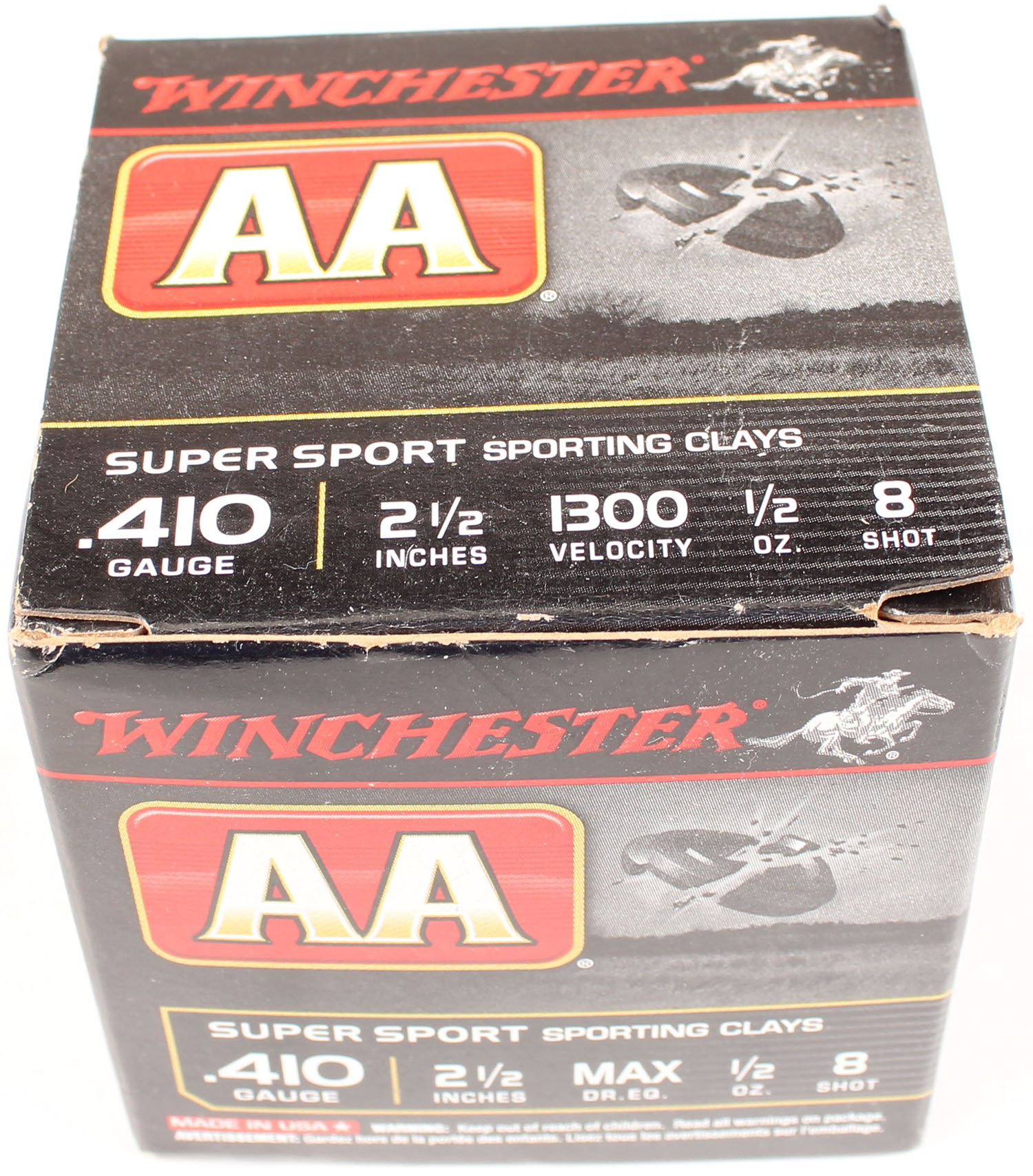 Winchester, AA, Super Sport, 410ga., 2 1/2'', 1pc., Full, shot size 8, multi-colored box, box is very solid with great colors, shells are excellent. Grade: Excellent ++ - Value: 10 to 30