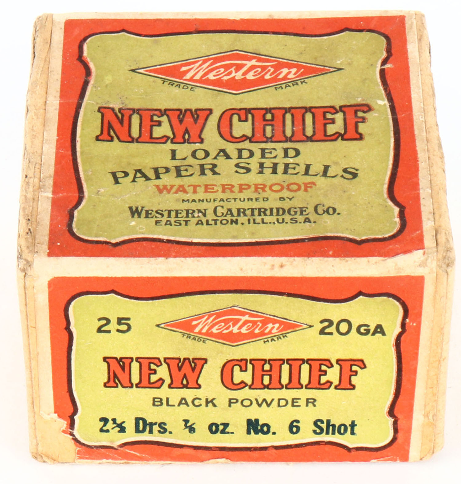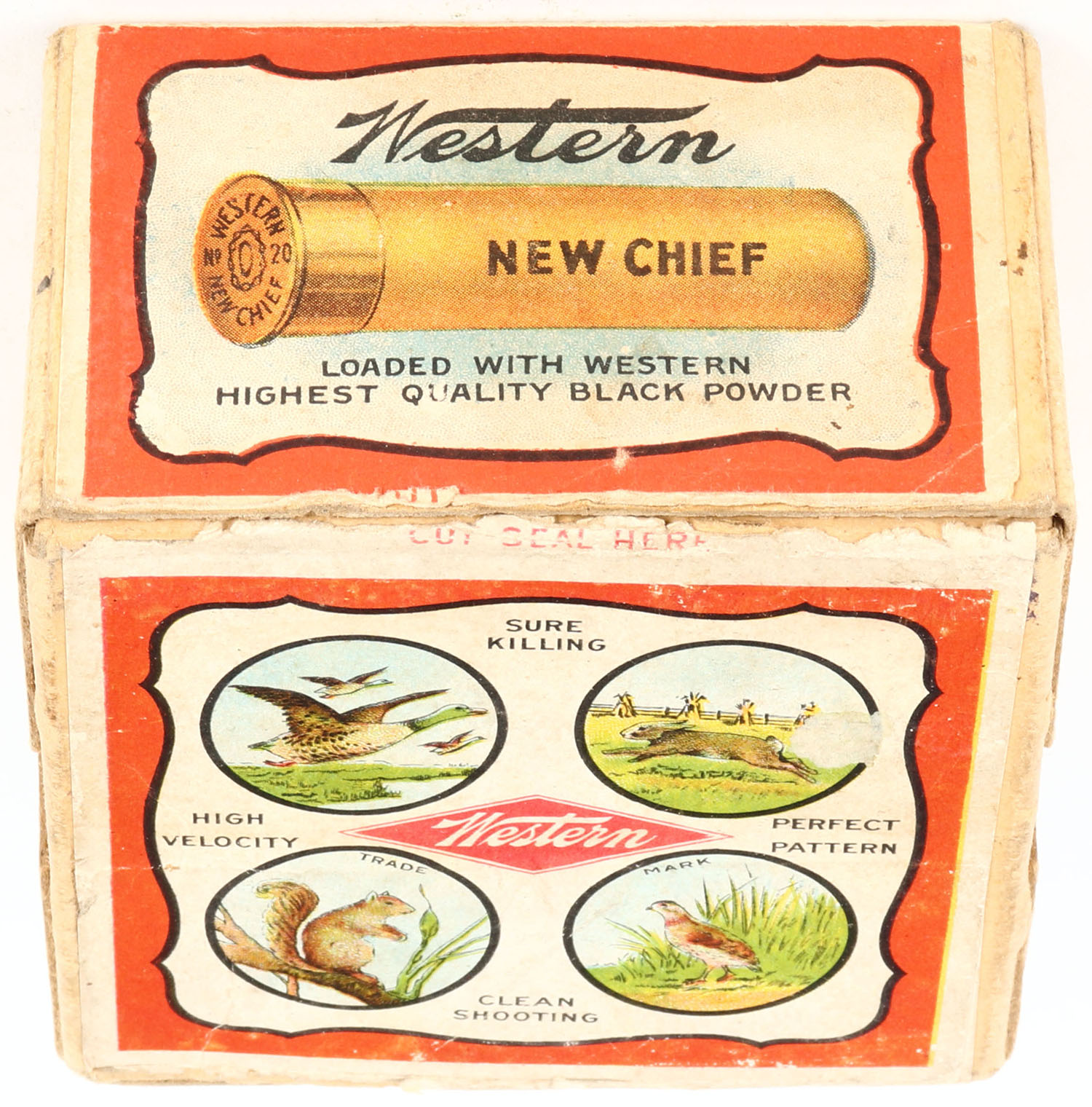 Western, NEW CHIEF, 20ga., 2pc., Empty, shot size Black Powder 2 1/2 Drs. 7/8 Oz. No. 6 Shot, buff box with green, red & black label, box has seam split, tape repair, age soiling with nice colors, Western Diamond Logo on 3 sides with rare bottom that pictures multiple animals. Grade: Very Good ++ - Value: 40 to 200