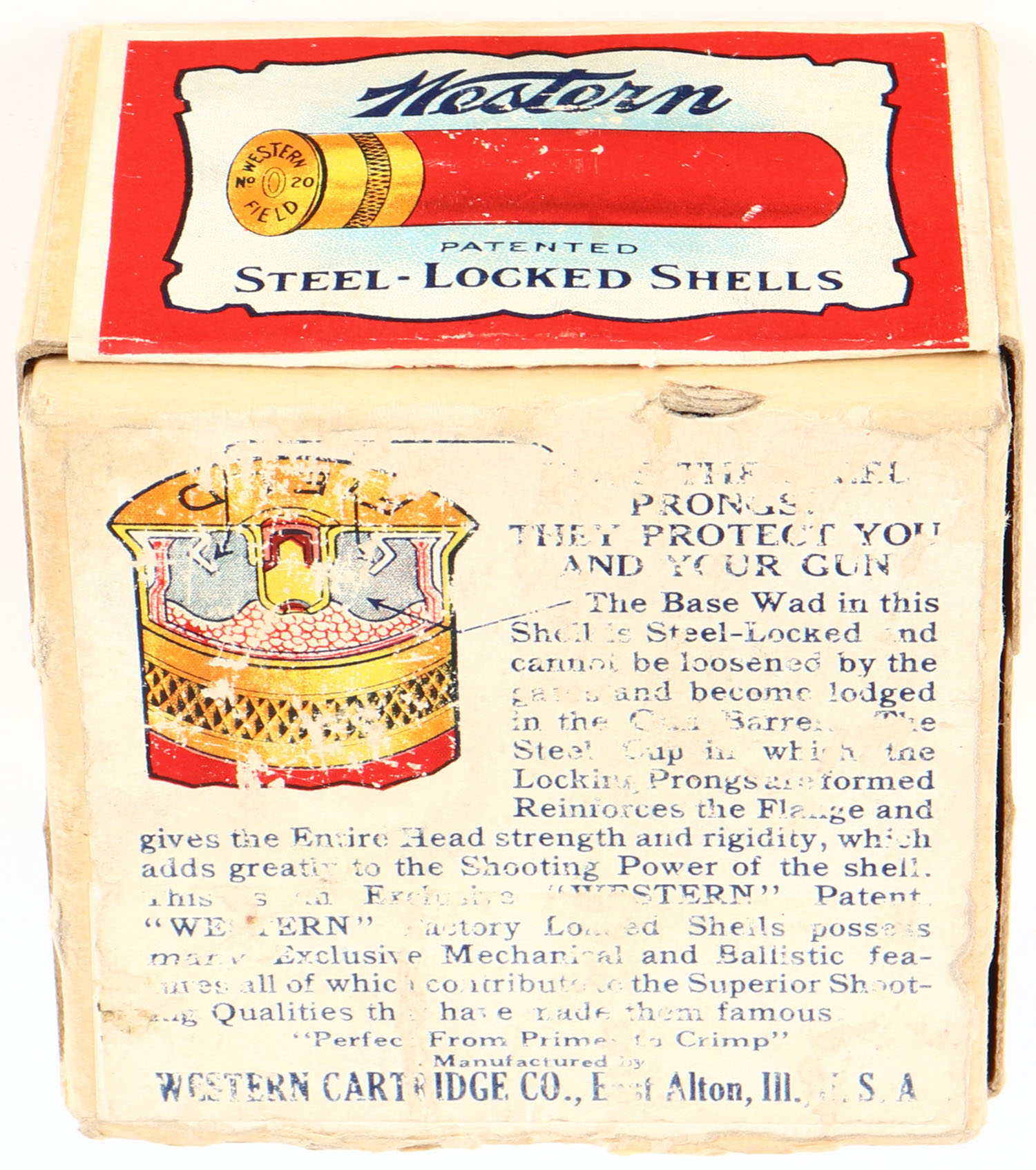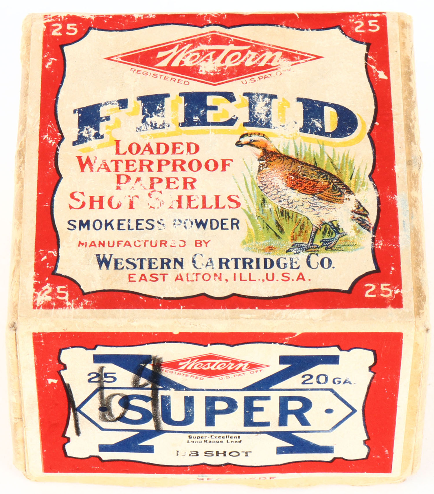 Western, Field/Super X, Label was made during transition from Field boxes to Super X boxes. 20ga., 2pc, Full, shot size BB, box has scuffing, shell protrusions & light edge wear with good label, Shells are excellent. Grade: Very Good ++ - Value: 60 to 250
