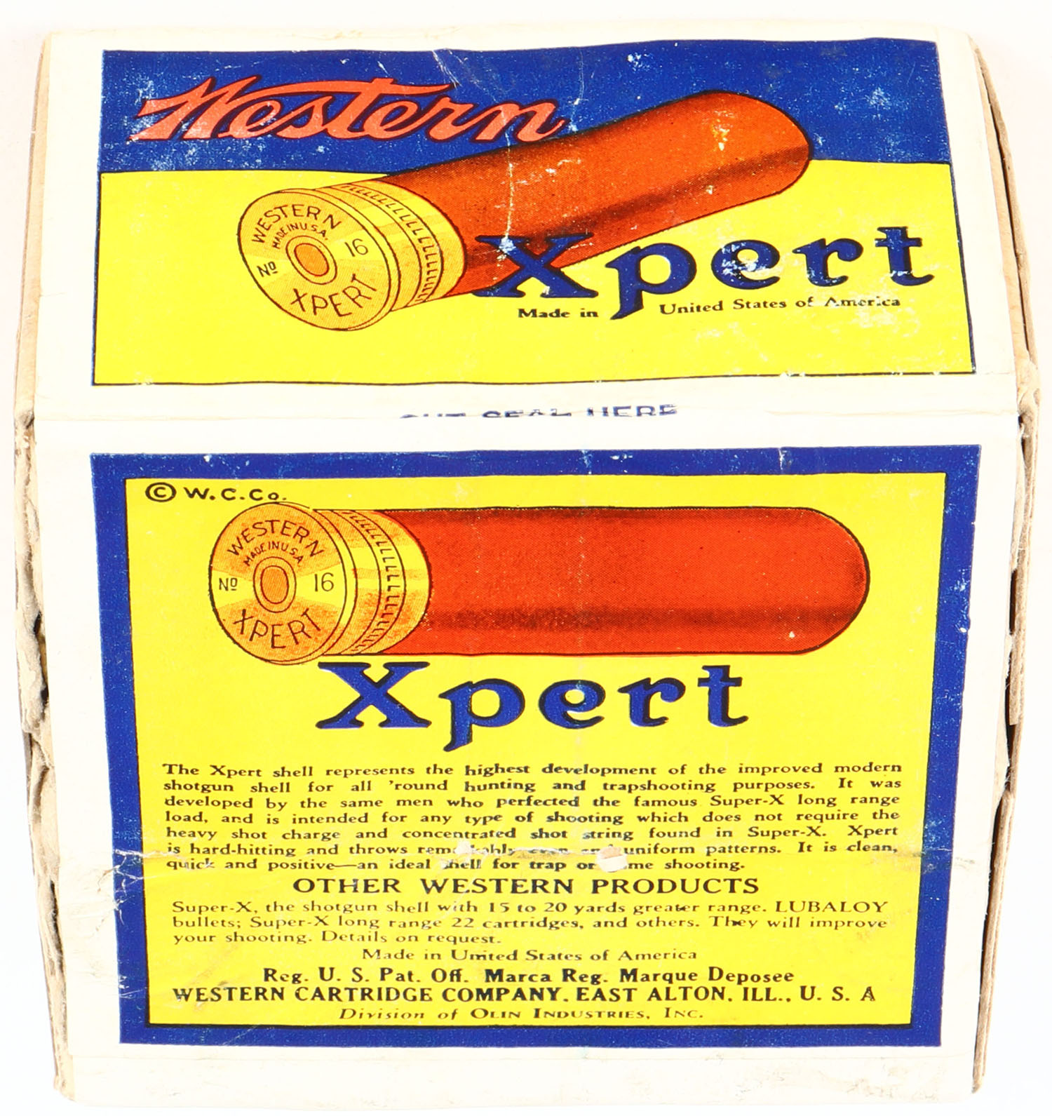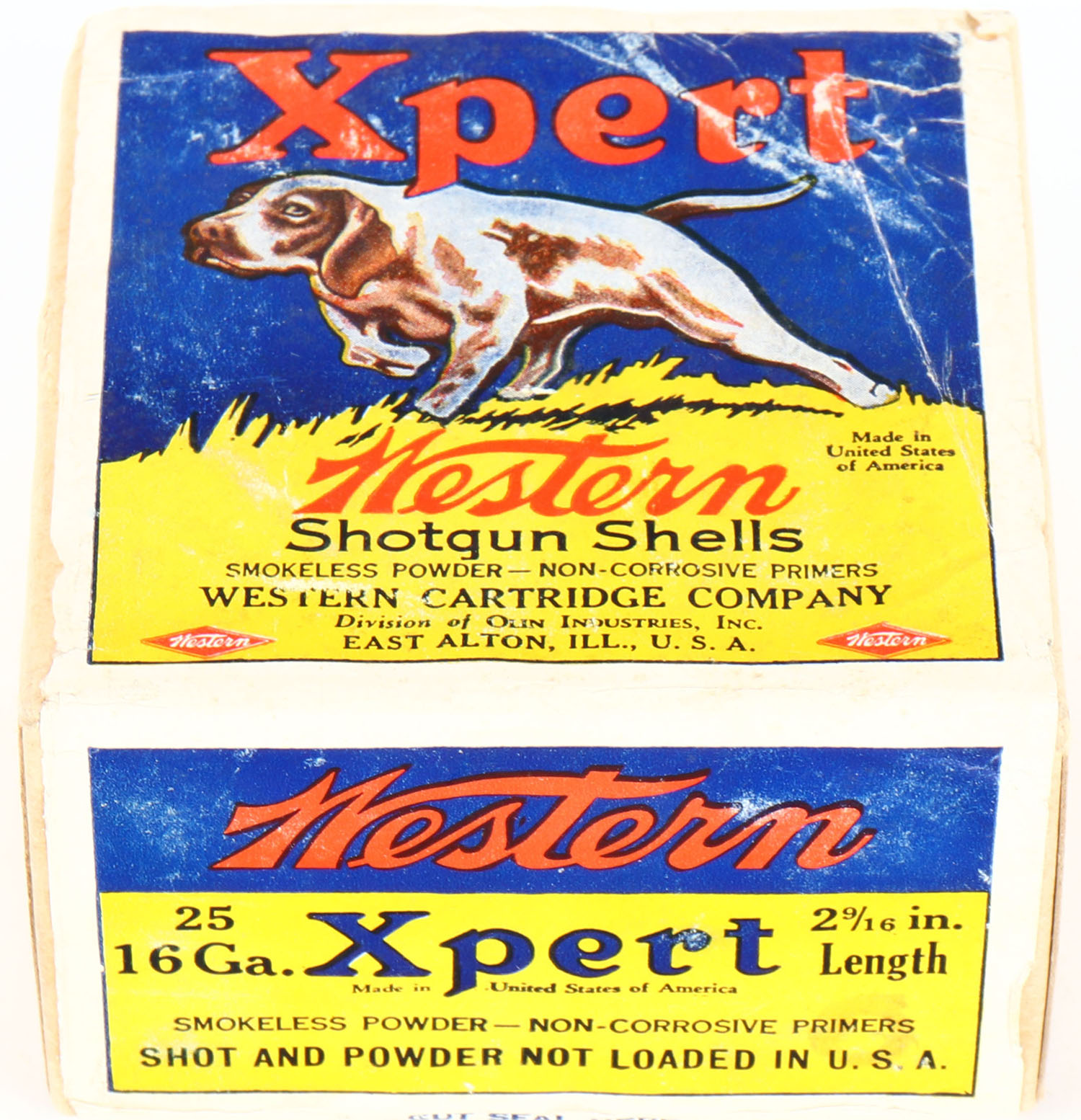 Western, Xpert, 16ga., 2 9/16'', 2pc., FULL and SEALED, shot size ?, buff box with blue and yellow paper label that pictures the pointer dog on top, box has seam split & light scuffing to label with great colors. Front of box says ''Shot and Powder Not Loaded In U.S.A'' but says ''Made In United States Of America'' on top of box, loaded in Mexico. Grade: Excellent - Value: 40 to 150