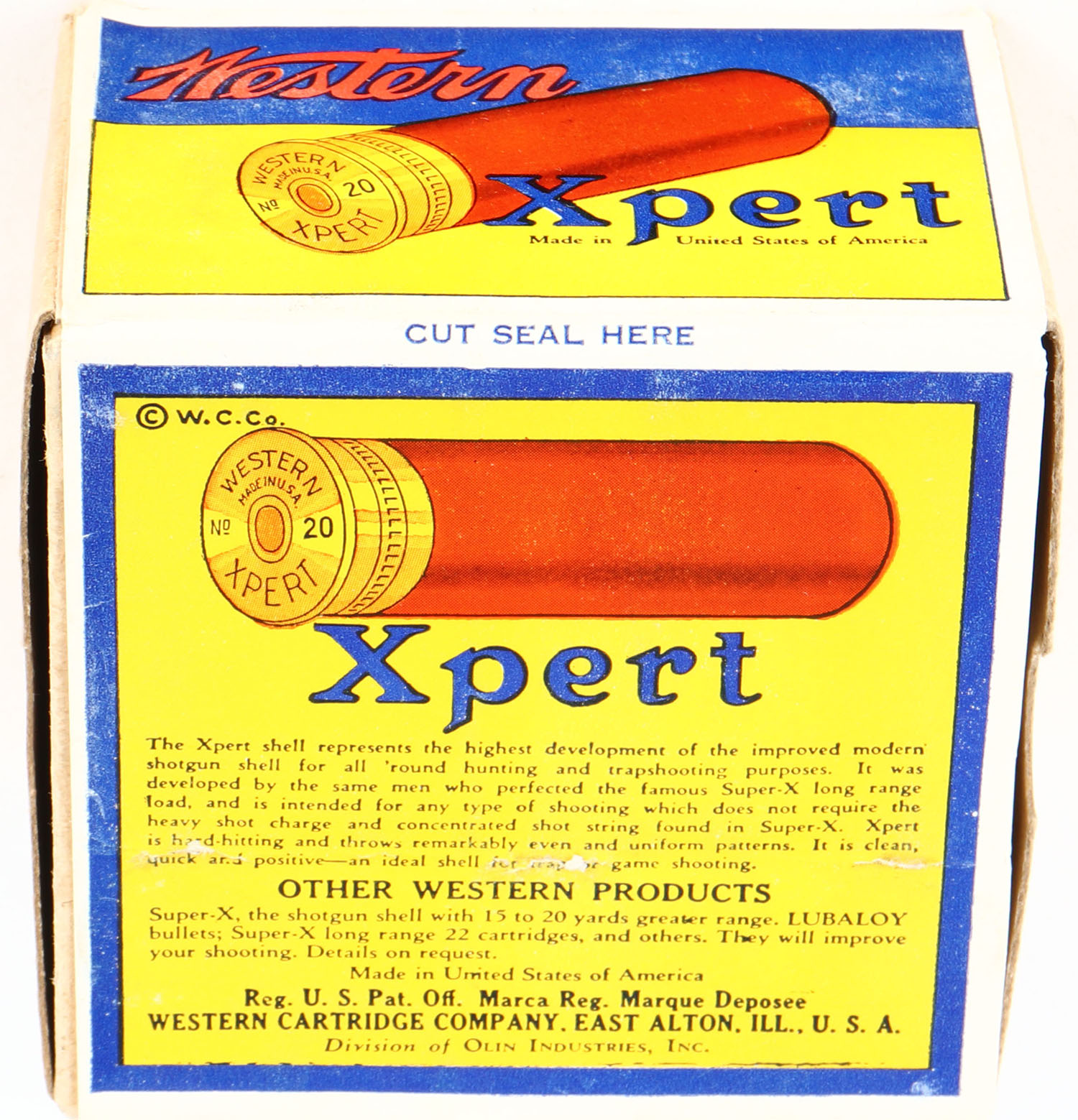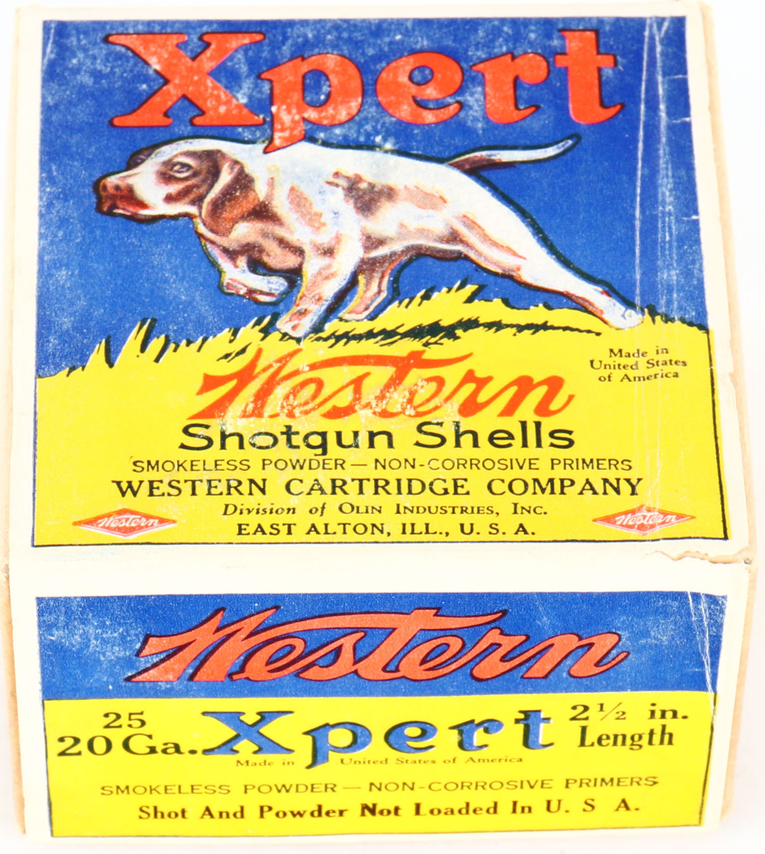 Western, Xpert, 20ga., 2 1/2'', 2pc., FULL and Half SEALED, shot size ?, buff box with blue and yellow paper label that pictures the pointer dog on top, box has light soiling & light scuffing to label with great colors. Front of box says ''Shot and Powder Not Loaded In U.S.A'' but says ''Made In United States Of America'' on top of box, loaded in Mexico. Grade: Excellent - Value: 40 to 150