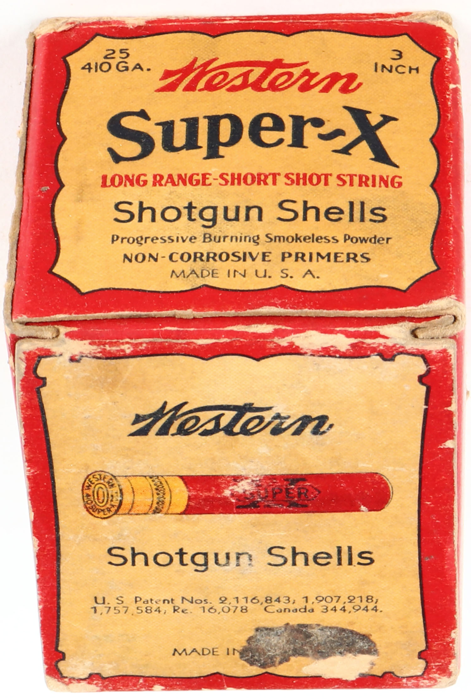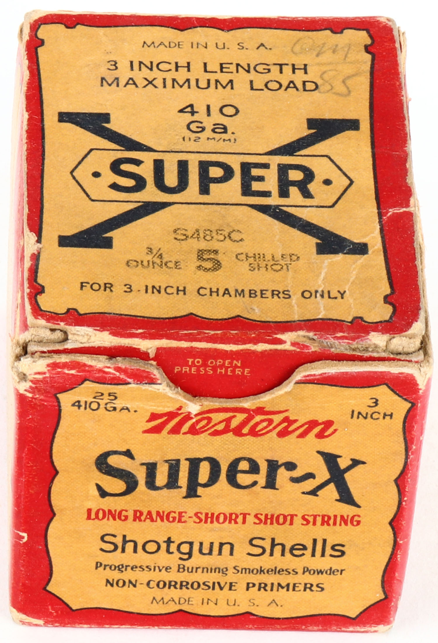 Western Cart. Co., Super X, 410ga., 3'' 1pc., Full with 9rds being correct brand & shot size, 5 Chilled Shot, red, buff & black box, box has light scuffing, light edge wear, light soiling, top inside flap is torn & has nice colors, Shells are very good. Grade: Very Good ++ - Value: 20 to 80