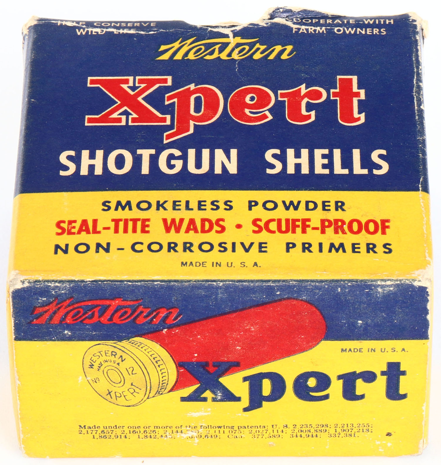 Western, Xpert, 12ga., 1pc., Partial 12rds., shot size 5, 2 5/8'', multi-colored box, box has light scuffing & light edge wear with very nice color & top inside flap is disconnected, shells are excellent. Grade: Very Good ++ - Value: 10 to 30