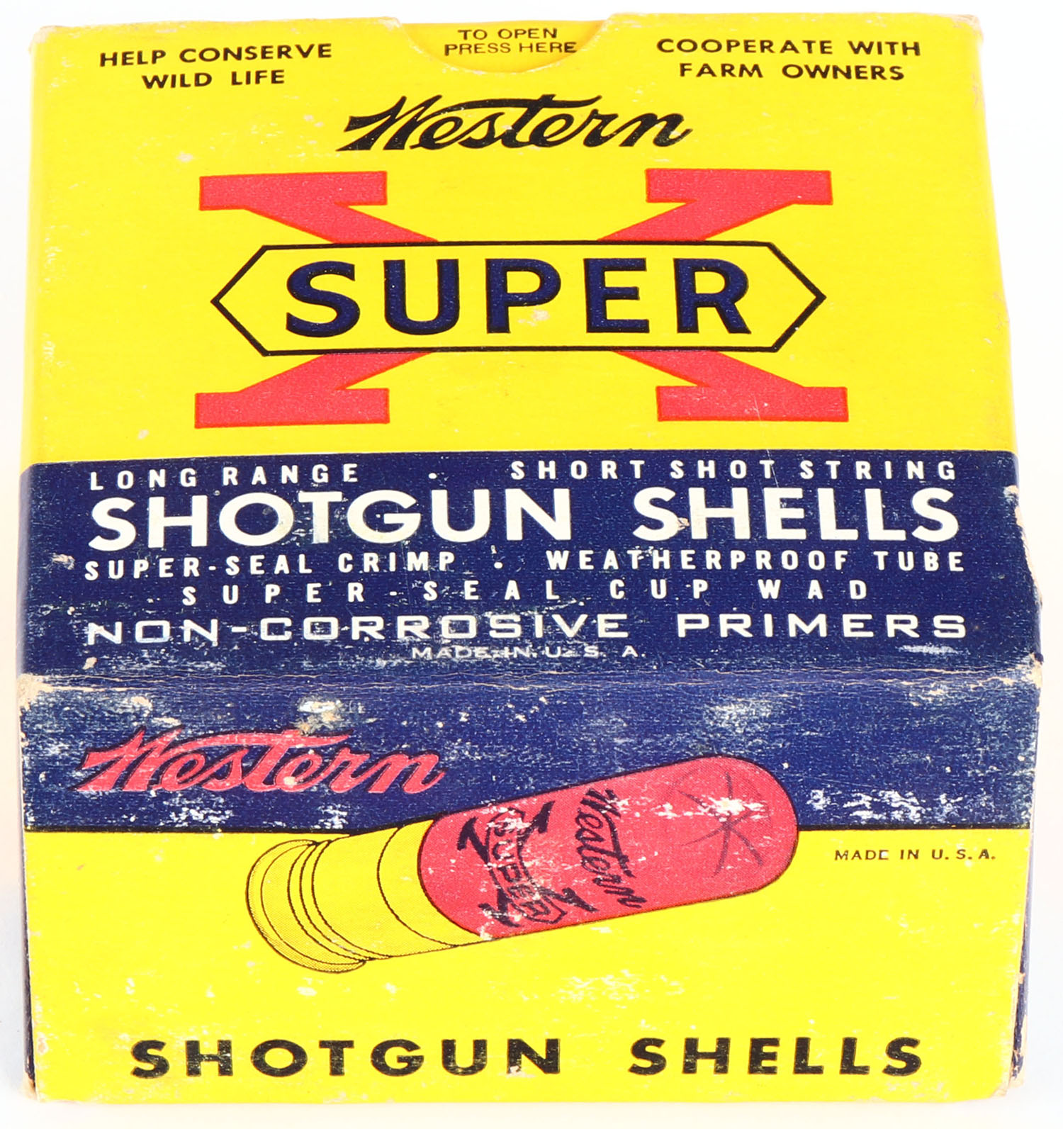 Western, Super X, 12ga., 1pc., Full, shot size 4, 2 3/4'', multi-colored box, box has light scuffing with great color, shells are excellent. Grade: Excellent - Value: 10 to 30