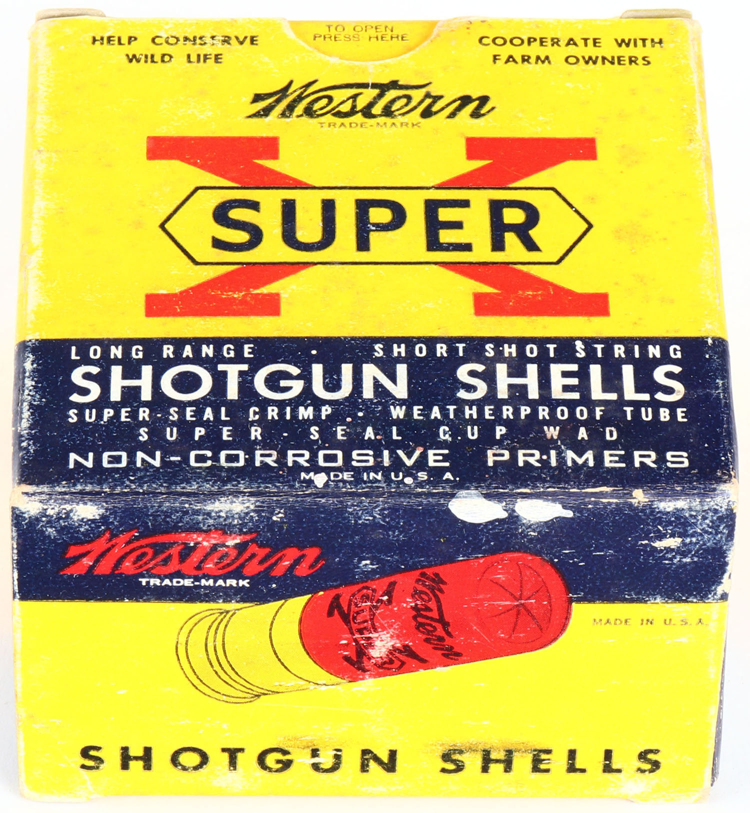 Western, Super X, 12ga., 1pc., Full with all rds being incorrect shot size, shot size 6, 2 3/4'', multi-colored box, box has light soiling with very nice color, shells are excellent. Grade: Excellent - Value: 10 to 30