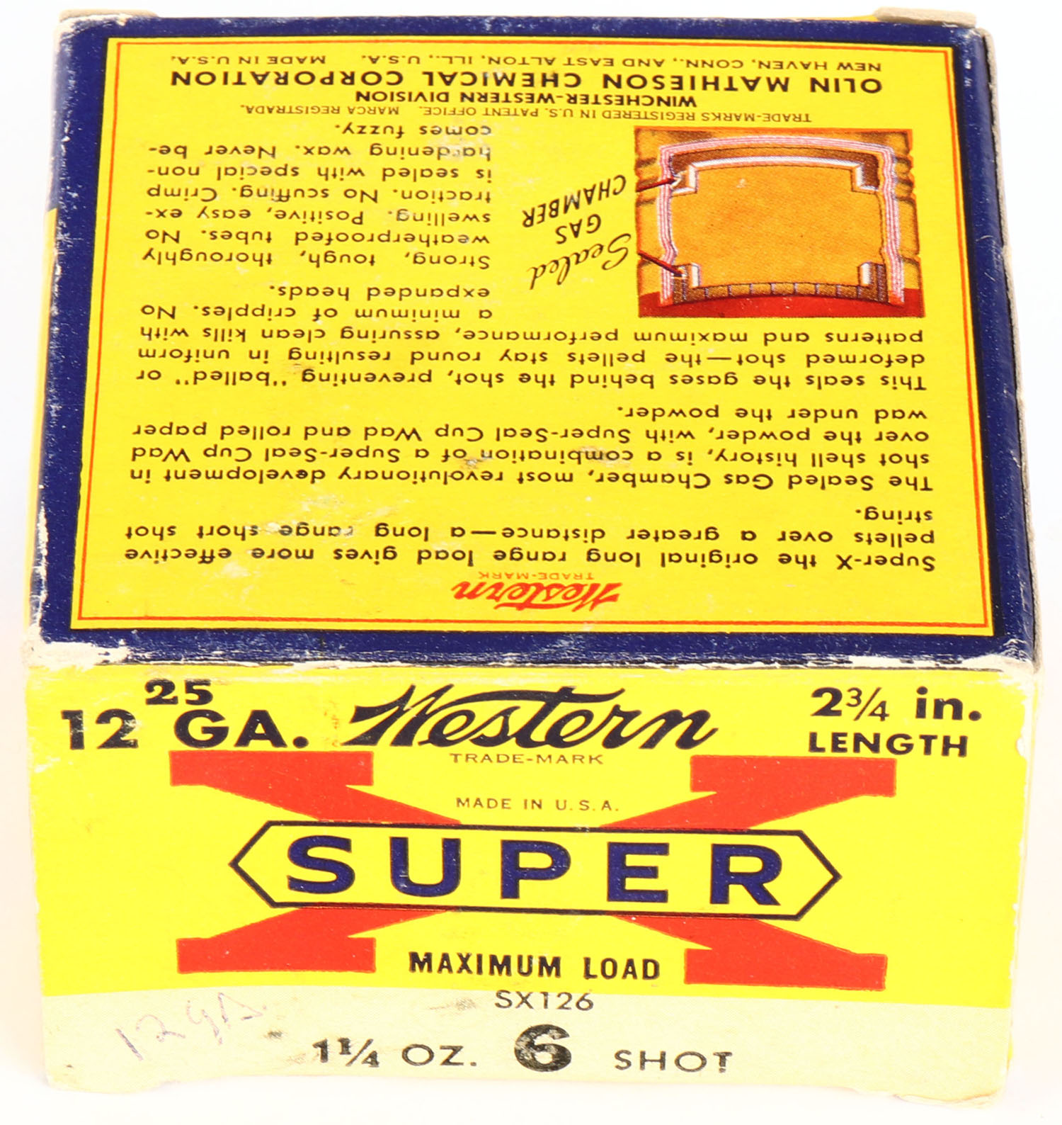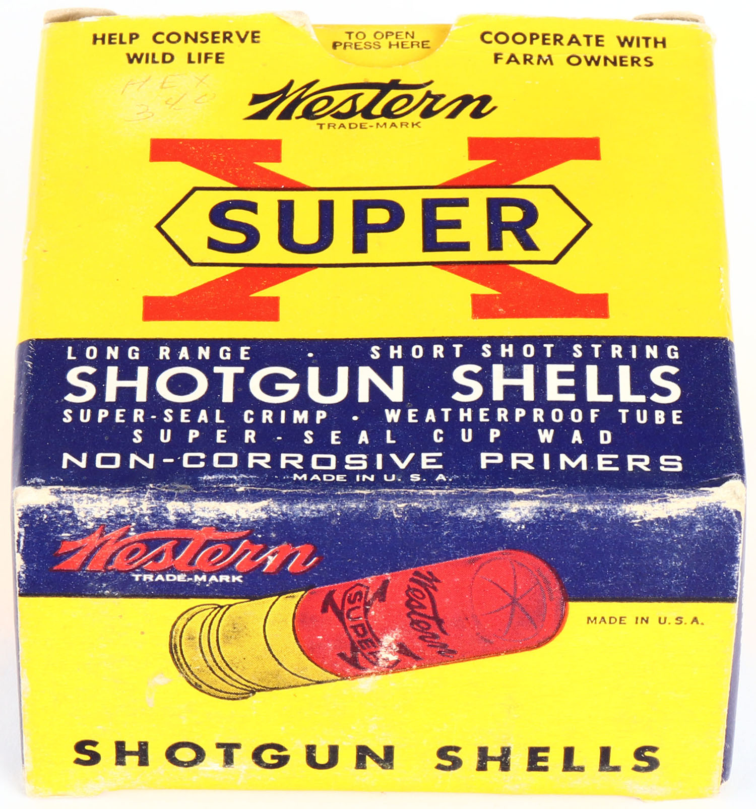 Western, Super X, 12ga., 1pc., Full, shot size 6, 2 3/4'', multi-colored box, box has light soiling with very nice color, shells are excellent. Grade: Excellent - Value: 10 to 30
