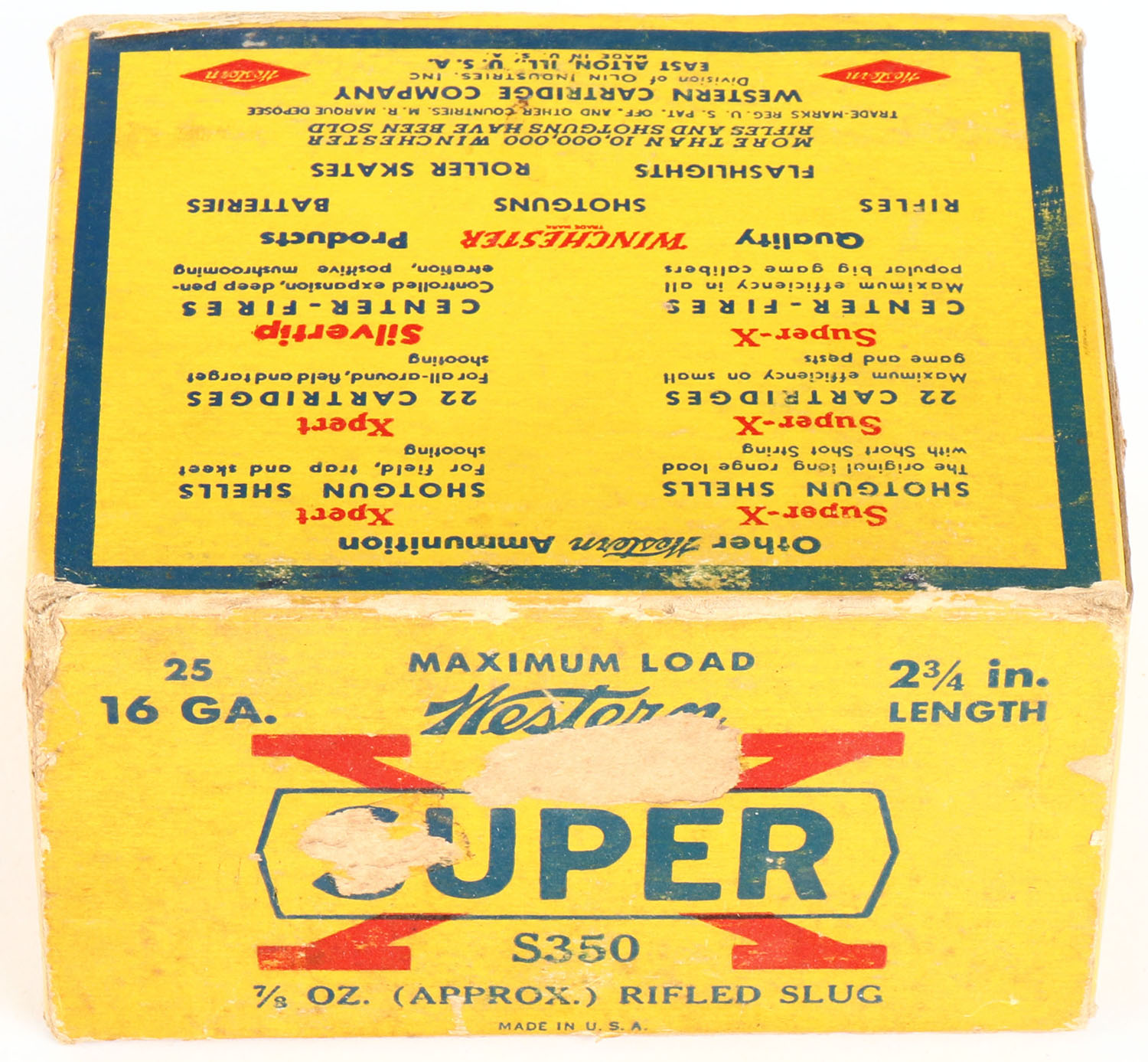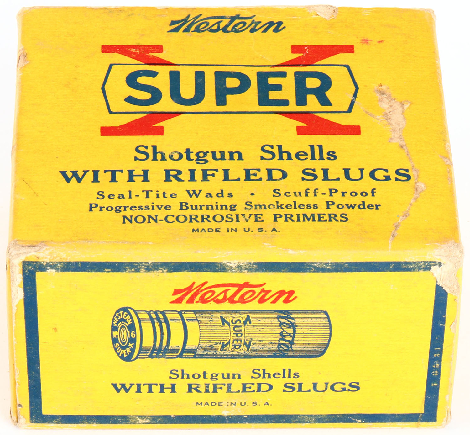 Western, Super X, 16ga., 2 3/4'', 1pc., Rifled Slugs, Full, yellow, blue & red box, box is solid with nice color, has light scuffing, light edge wear & age soiling there are 5 inside boxes each containing 5rds., Shells are very good. Grade: Very Good ++ - Value: 20 to 60