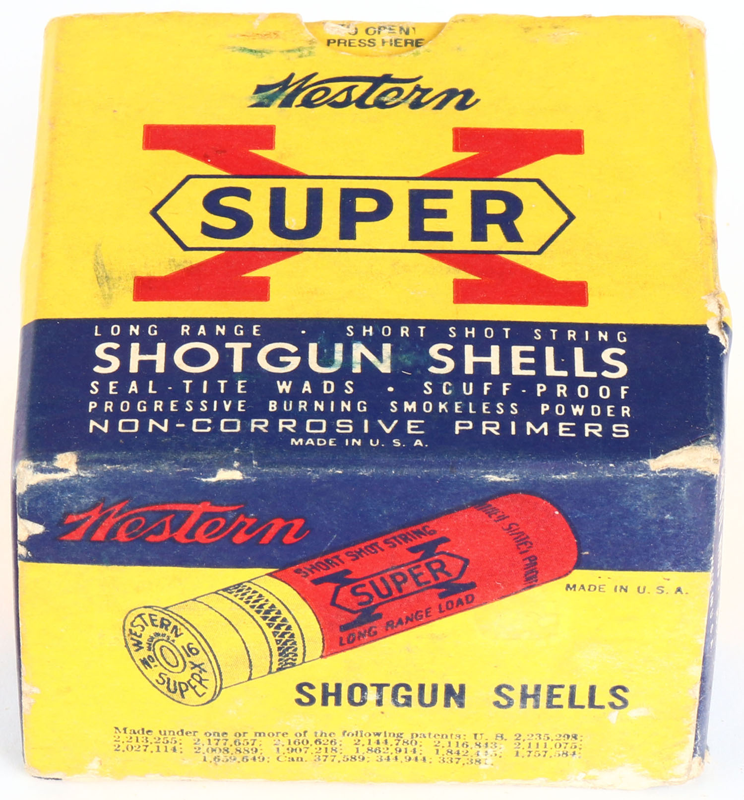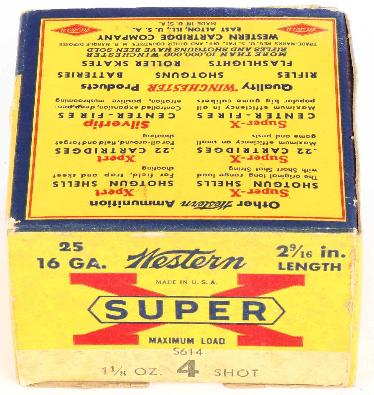 Western, Super X, 16ga., 1pc., Full, shot size 4, 2 9/16'', multi-colored box, box has light soiling & light edge wear with very nice color, shells are excellent. Grade: Very Good ++ - Value: 10 to 30