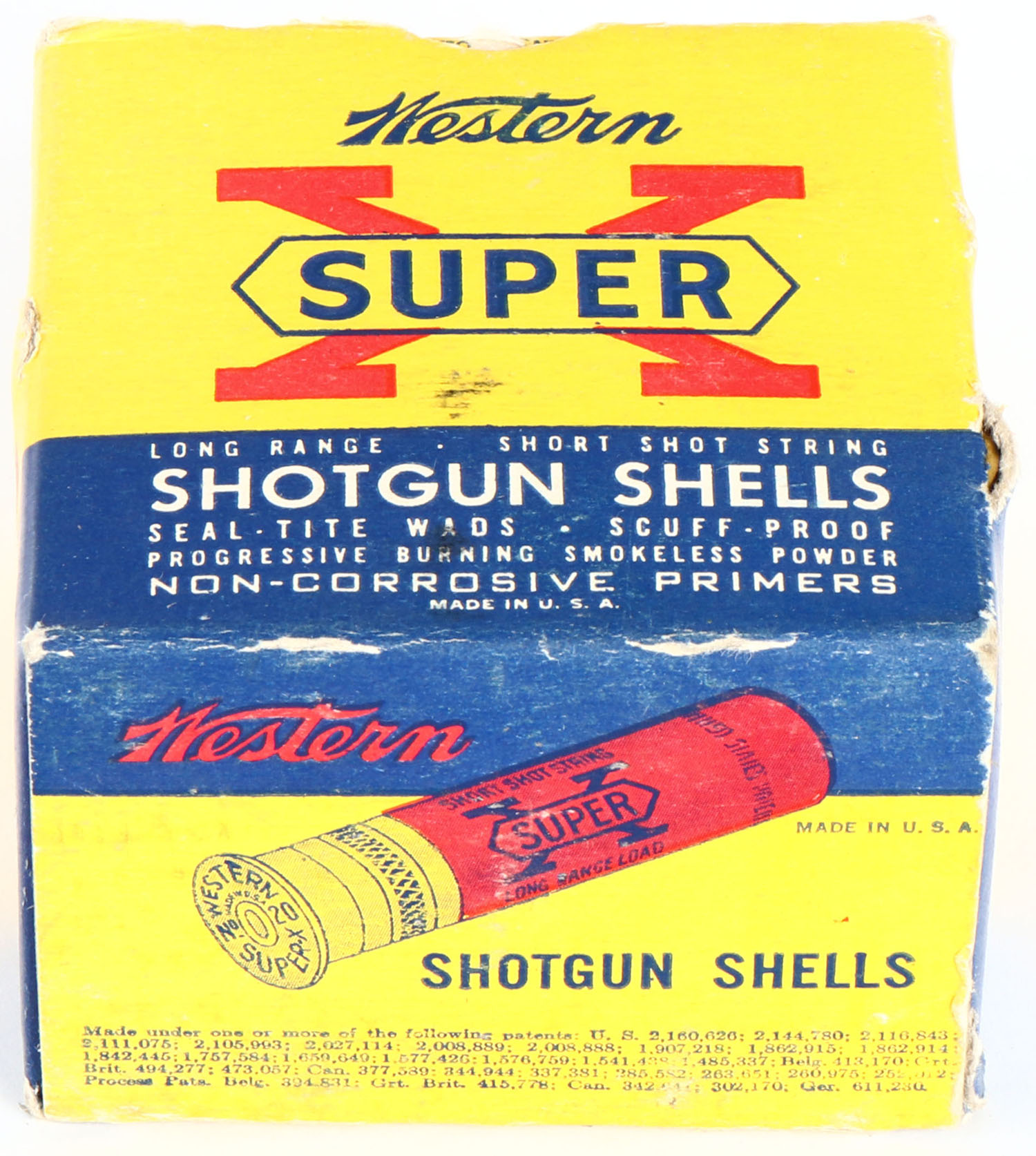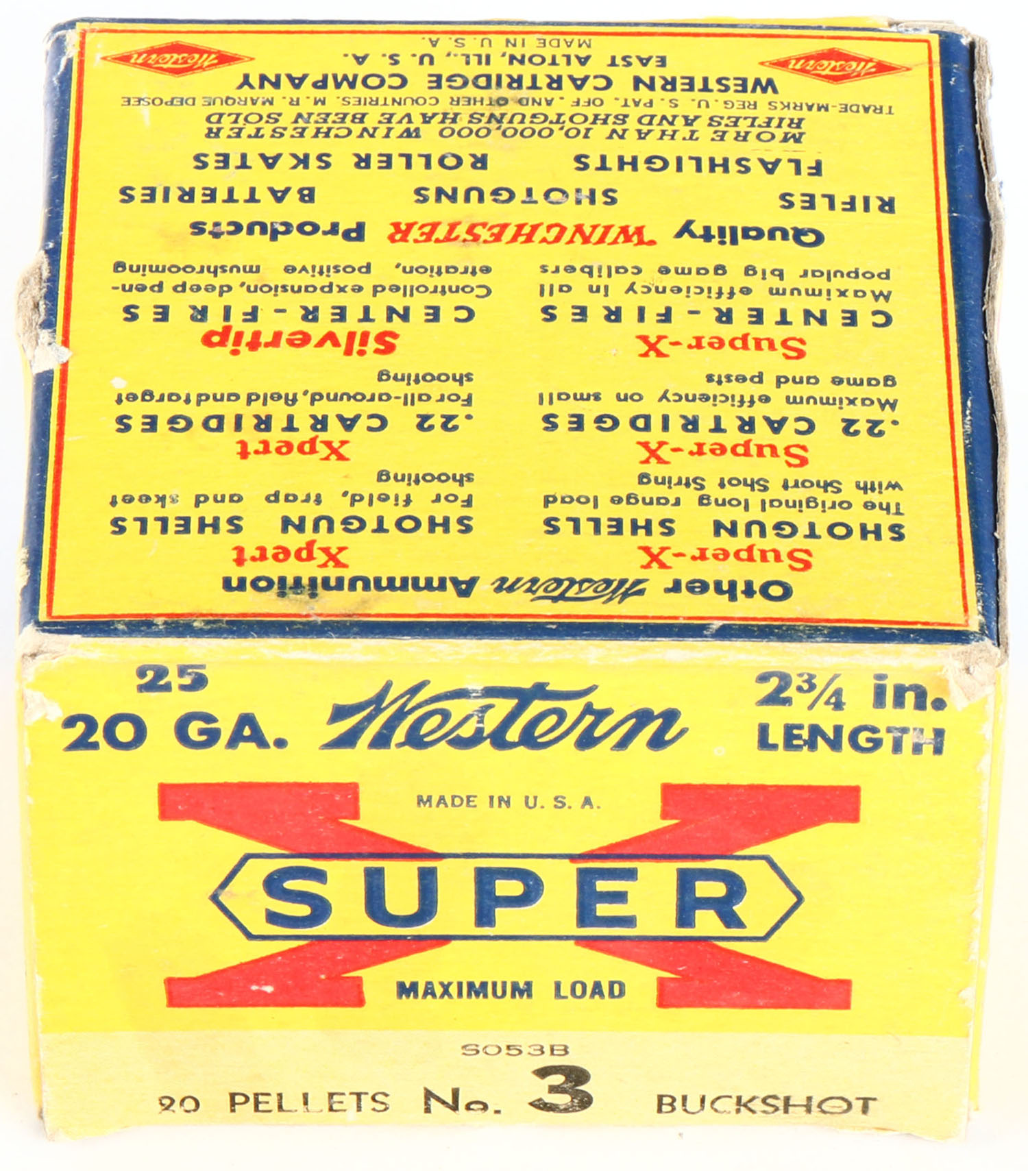 Western, Super X, 20ga., 1pc., Full, shot size 20 Pellets, 3 Buckshot, 2 3/4'', multi-colored box, box has shell protrusions with great color, shells are excellent. Grade: Excellent - Value: 10 to 40