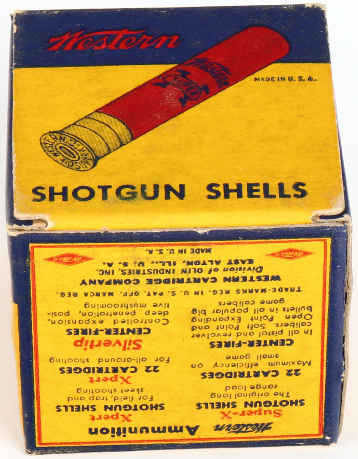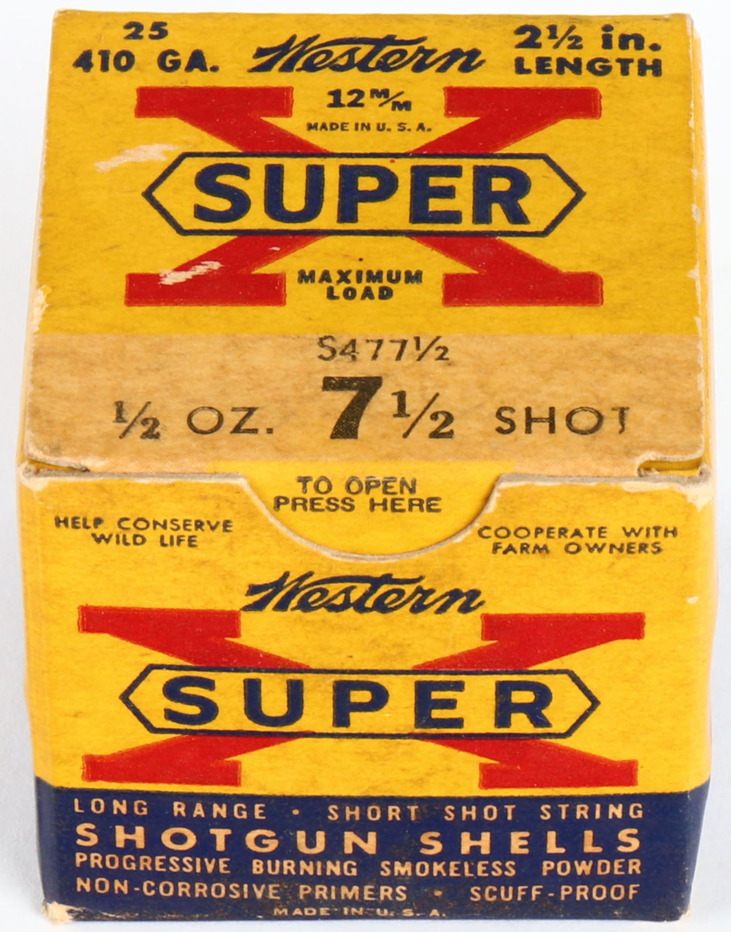 Western, Super X, 410ga., 1pc., Full, shot size 7 1/2, 2 1/2'', multi-colored box, box has light soiling with very nice color, shells are excellent. Grade: Very Good ++ - Value: 10 to 40